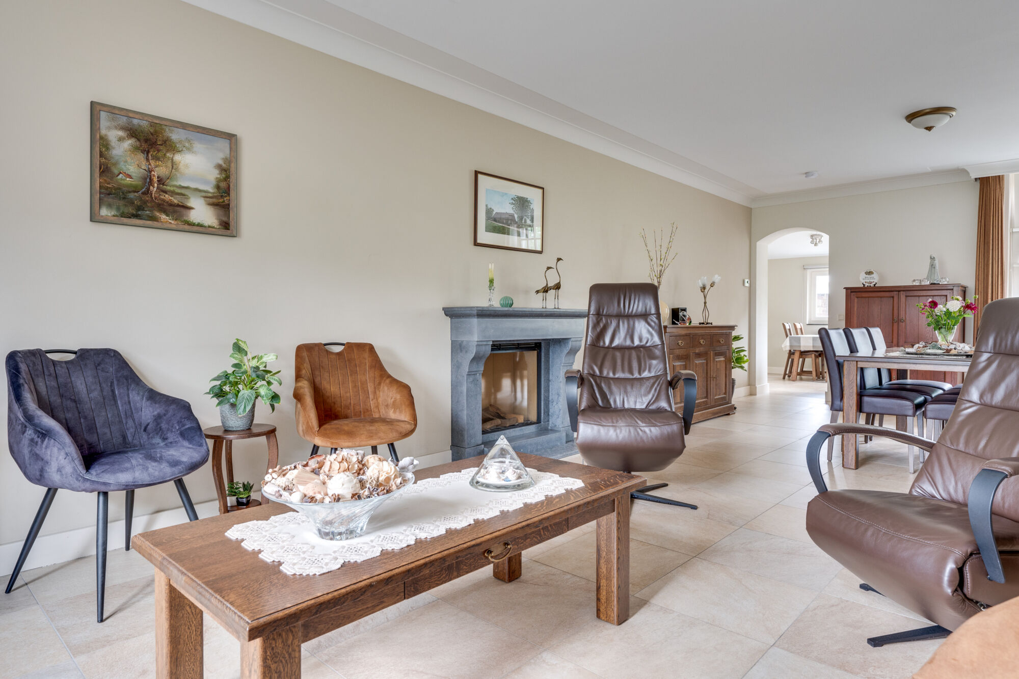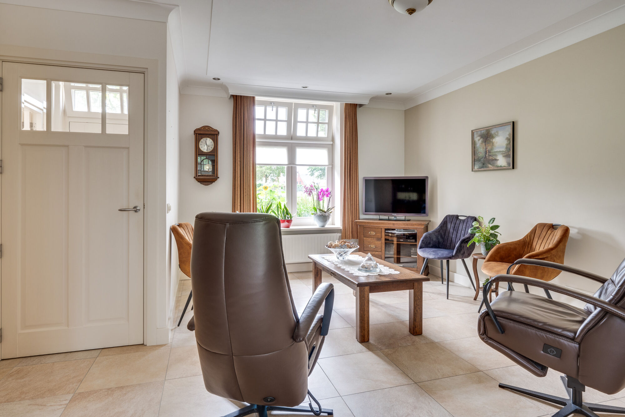 De woonkamer is voorzien van een tegelvloer met vloerverwarming. De wanden en plafonds zijn gestuct en afgewerkt met sierlijsten. De stompe deuren maken het geheel af. De woonkamer biedt toegang tot de ruime slaapkamer, de trapopgang en de keuken.