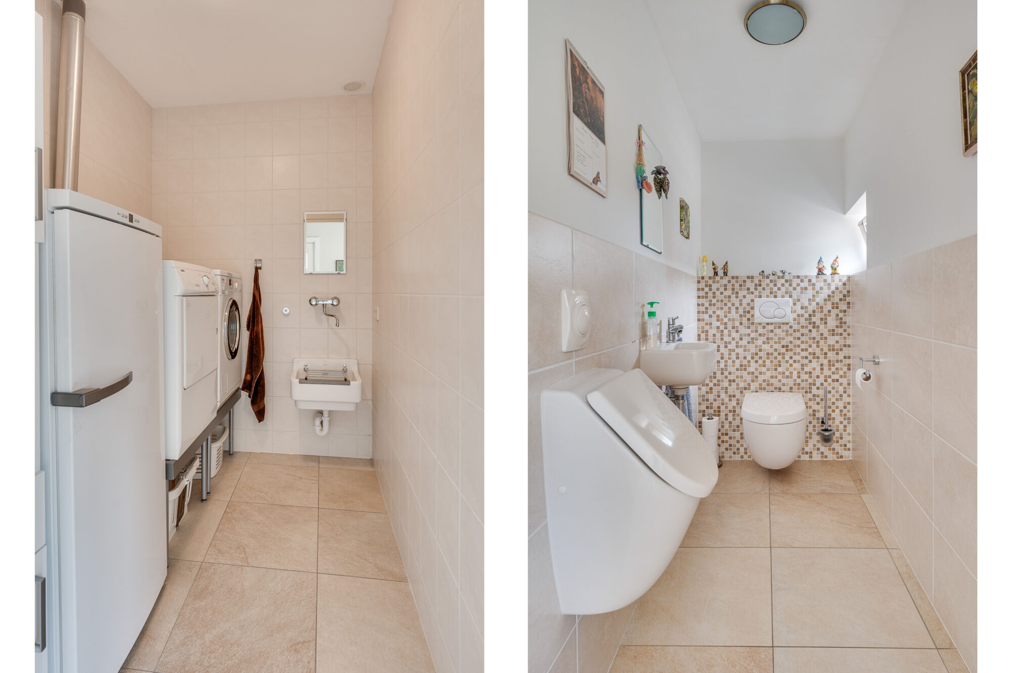 Vanuit de keuken komen we terecht in de hal welke op zijn beurt weer toegang geeft tot de toiletruimte, wasruimte en zeer ruime inpandige garage. De toiletruimte is voorzien van hangend toilet, urinoir en fontein. In de wasruimte is ook nog voldoende ruimte om een koelkast en vriezer te plaatsen. Tevens is er een uitstortgootsteen aanwezig.