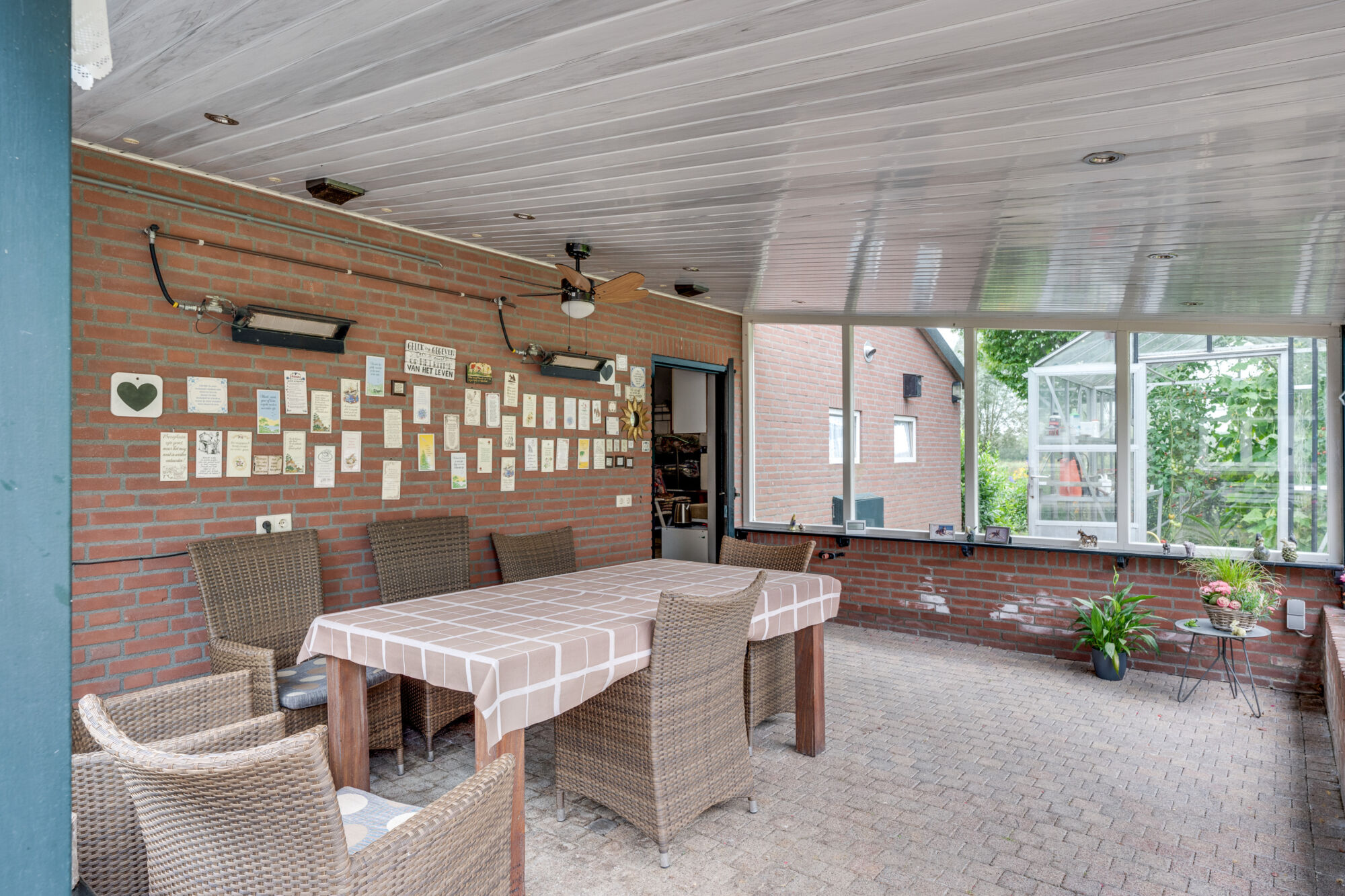 De tuin is rondom aangelegd met diverse gazonnen, border met sierbeplanting en diverse volwassen bomen. Zodoende kunt u altijd wel een gezellig plekje vinden om te zitten. Het bijgebouw met overkapping is gesplitst in een werkruimte, garage en (fietsen) berging. De zonnepanelen zijn hier geplaatst. Ook deze ruimte is multifunctioneel te gebruiken.