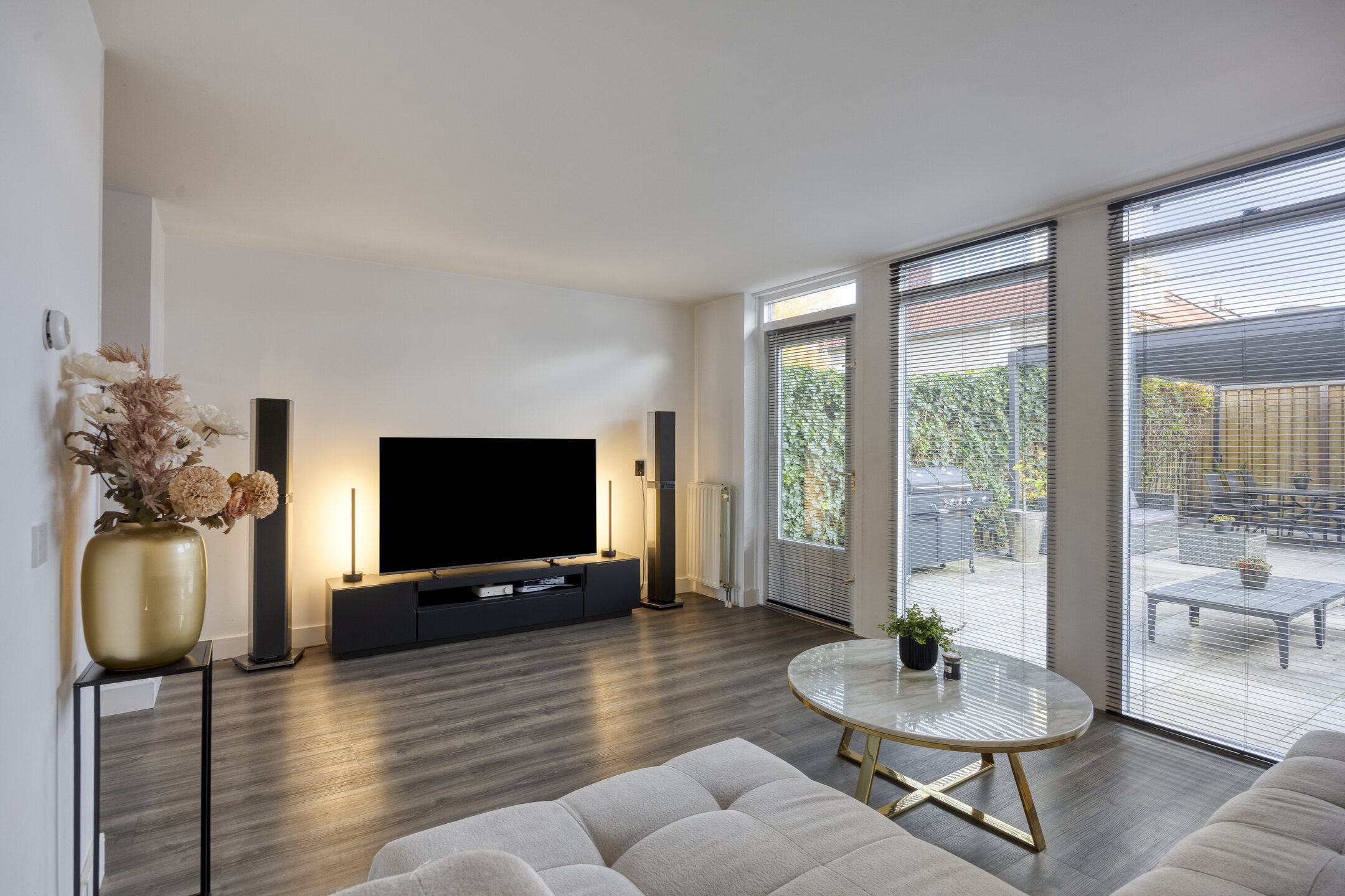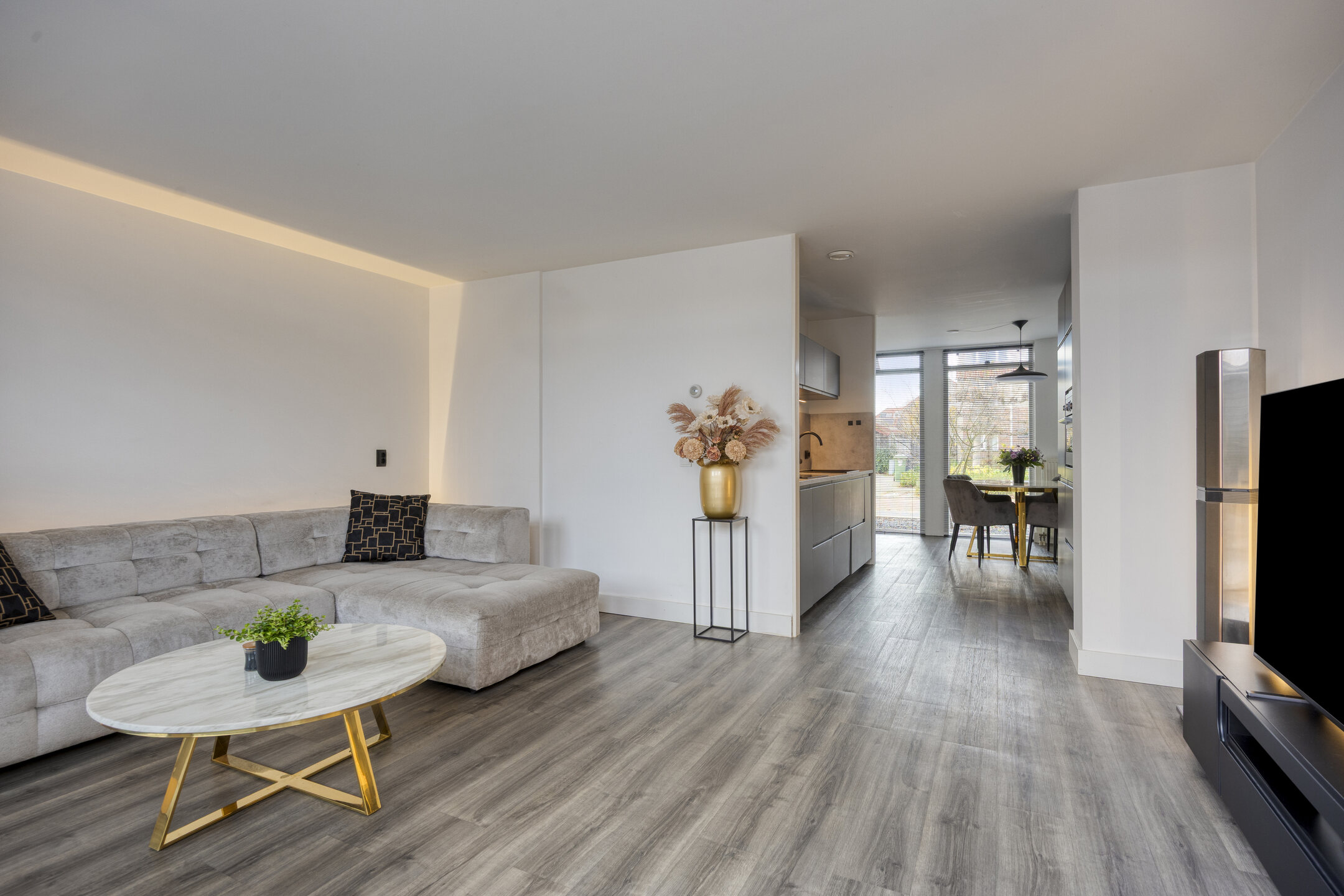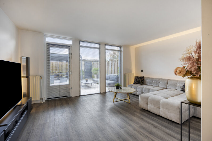 De woonkamer bestaat uit een eethoek en een zithoek met daartussen de fraaie keuken. De eethoek kijkt uit over de straat. Ook hier hetzelfde strakke stukwerk en mooie vloer. De zithoek is aan de achterzijde gelegen. De grote ramen tot aan de vloer geven je zicht op het terras en de tuin met overkapping en zorgen voor veel lichtinval. Doordat je geen directe achterburen hebt, heb je hier veel privacy.