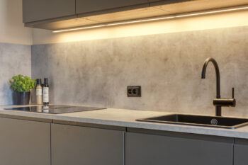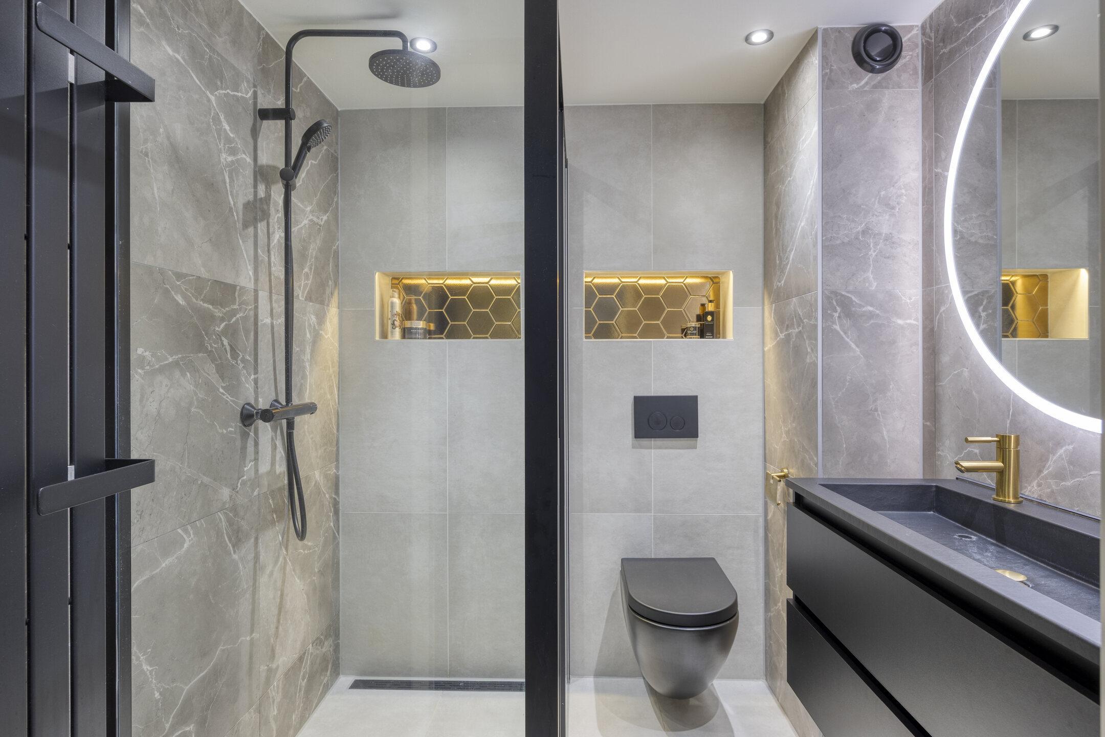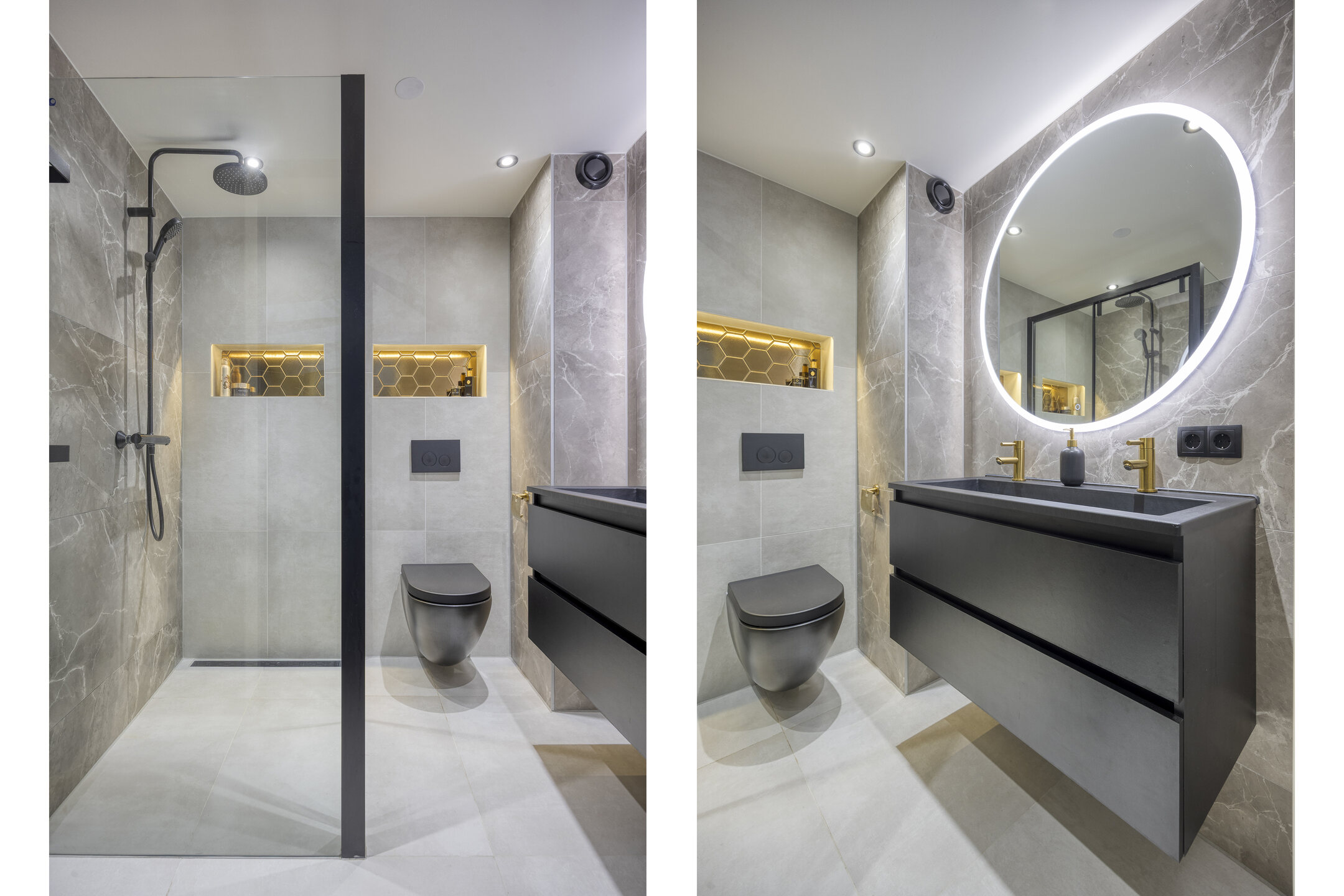 Wat een beauty deze badkamer! Deze is in december 2022 geplaatst. Ook hier is voor kwaliteit gekozen. Zo zijn er nieuwe tegels geplaatst, is er gekozen voor mooie goudkleurige kranen en accessoires en kwalitatief goed sanitair. Ook hier strak stucwerk en spotverlichting. Boven het badmeubel hangt een grote spiegel met geïntegreerde verwarming en verlichting. Verder is er een modern vrijhangend toilet, een inloopdouche met thermostaatkraan, regendouche en handdouche en zijn er nissen gemaakt met hexavormige designtegeltjes. Er zijn extra lussen in de vloer gelegd van de verwarming waardoor de vloer niet koud aanvoelt. Een designradiator zet het puntje op de i in deze ‘hotel boutique chique’ badkamer!