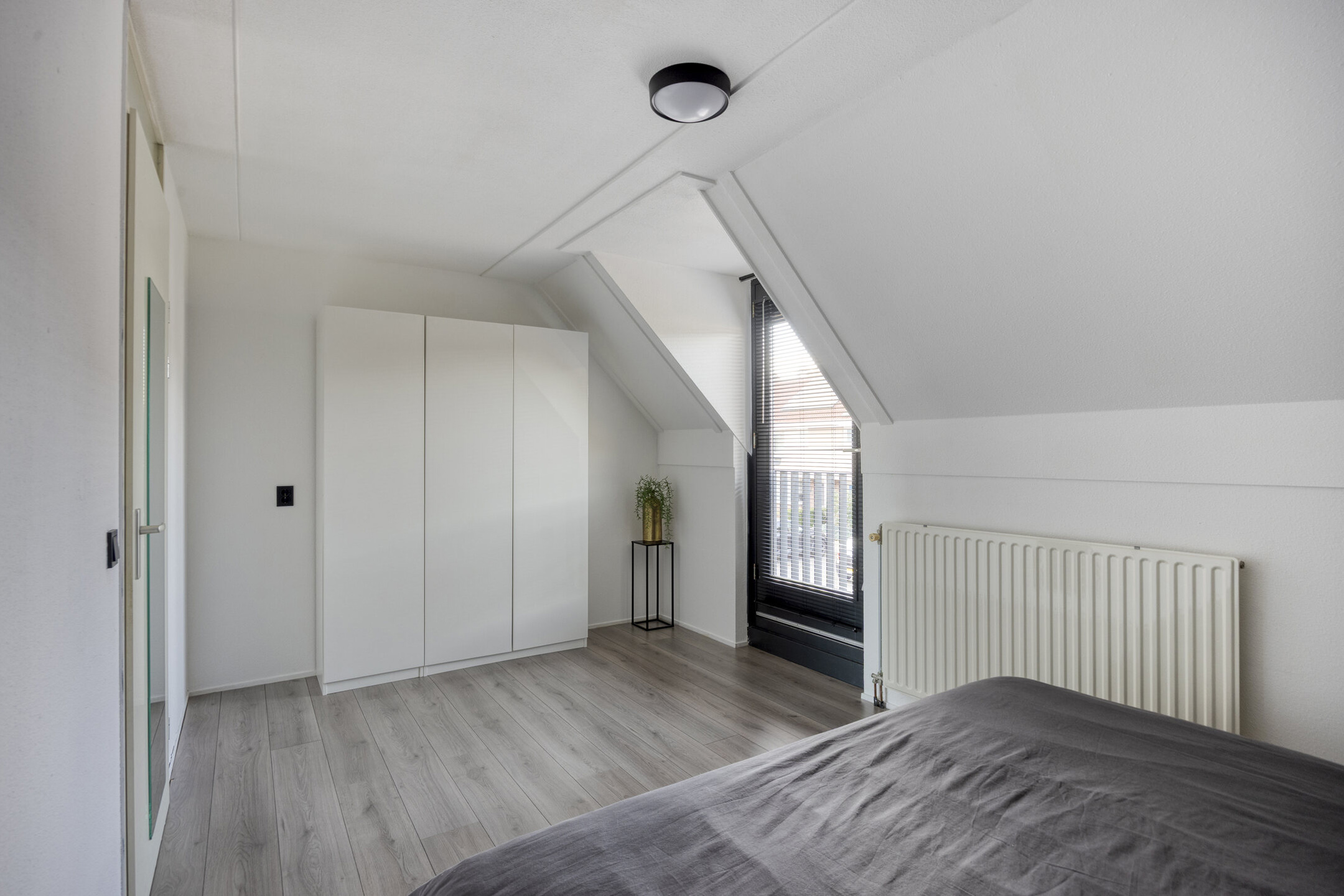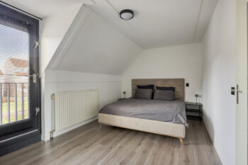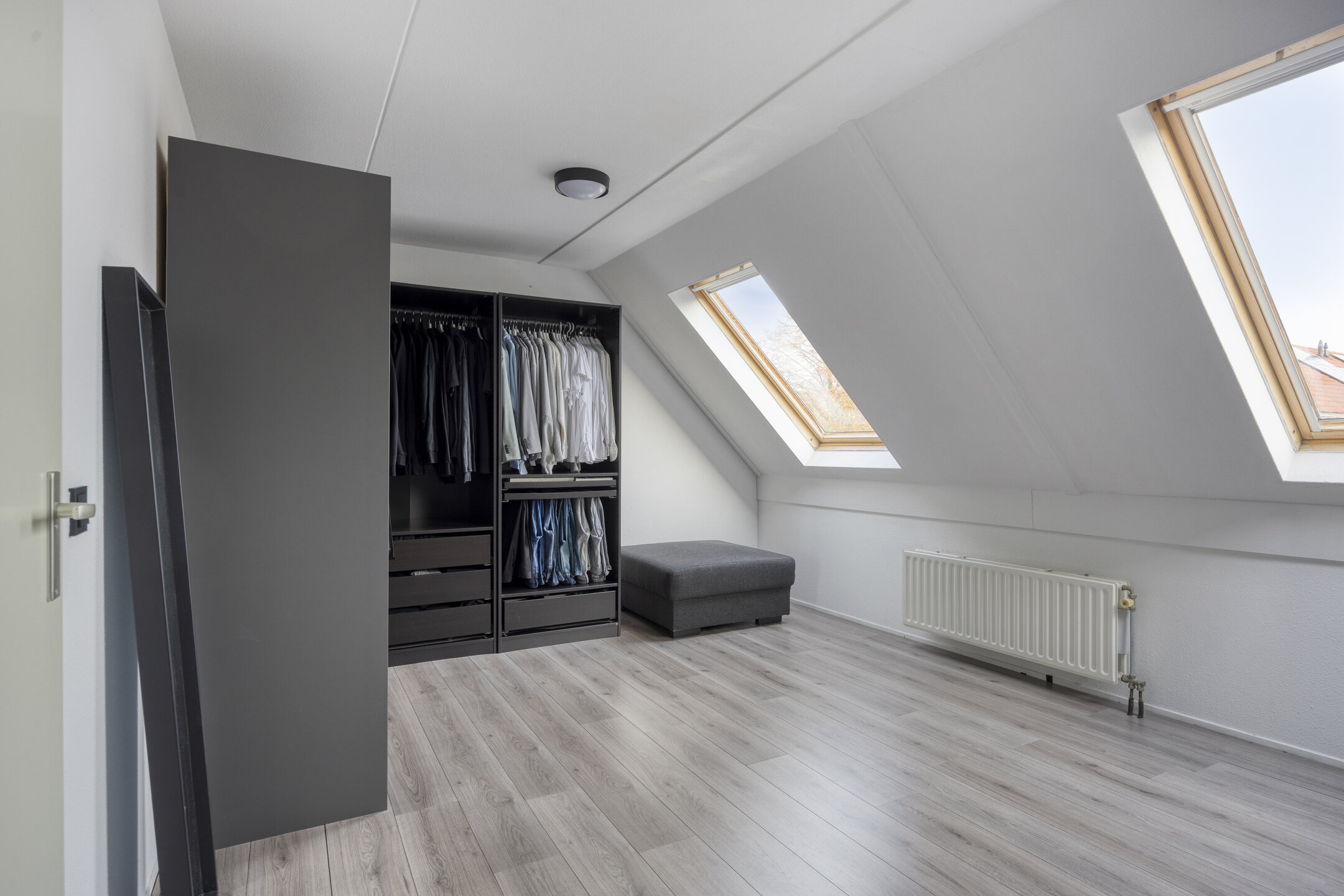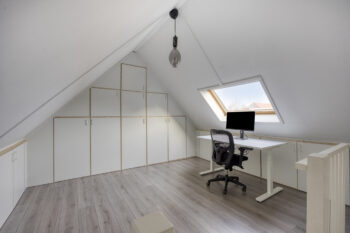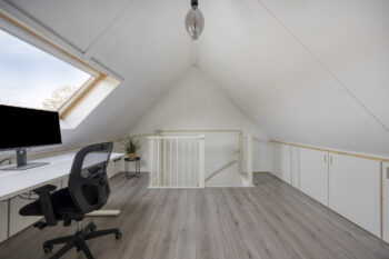 Ook op deze verdieping ligt het mooie laminaat en zijn er extra wandcontactdozen geplaatst. In 2025 zijn er nieuwe inbouwkasten geplaatst met volop bergruimte. De wasmachine, droger, cv en mechanische ventilatie zijn allemaal ingebouwd. Deze kamer is nu in gebruik als werkkamer, maar zou ook een fijne derde slaapkamer kunnen zijn.