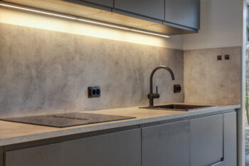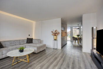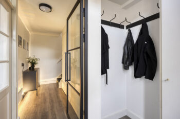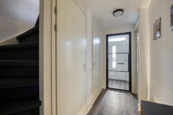 De hal geeft toegang tot het moderne toilet, de trapopgang naar de eerste verdieping en de woonkamer met open keuken en een voorraad trappenkast. Meteen valt de mooie pvc vloer, omlijst met hoge plinten en het strakke stucwerk op. Je ziet meteen dat alles kwaliteit en sfeer uitstraalt.