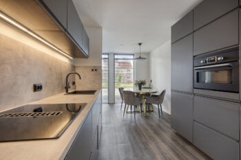 Wat een mooie keuken! Deze is in 2023 geplaatst. Doordat de keuken tussen de eethoek en de zithoek is geplaatst, heb je altijd wel contact met elkaar, ook als je staat te kokkerellen.