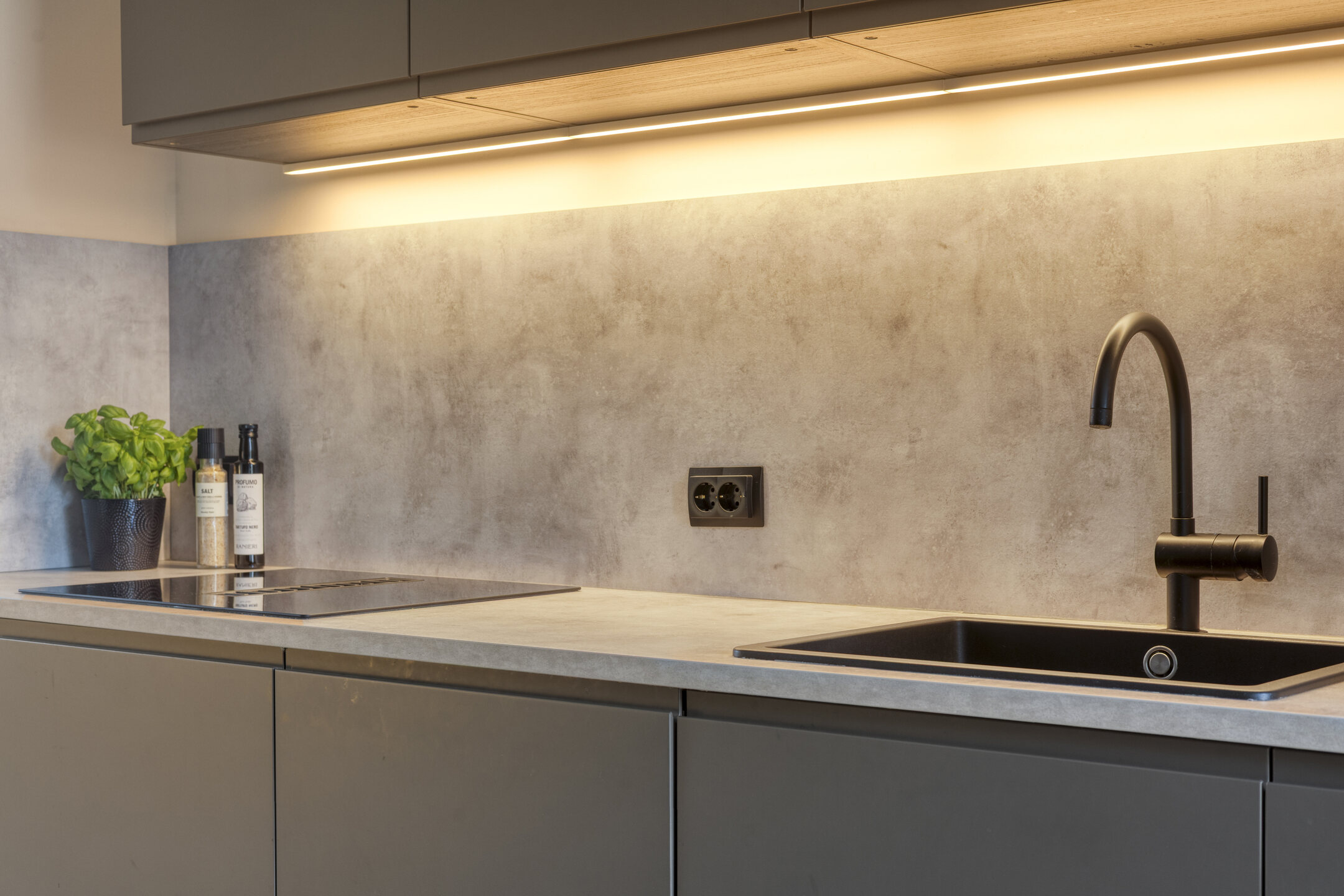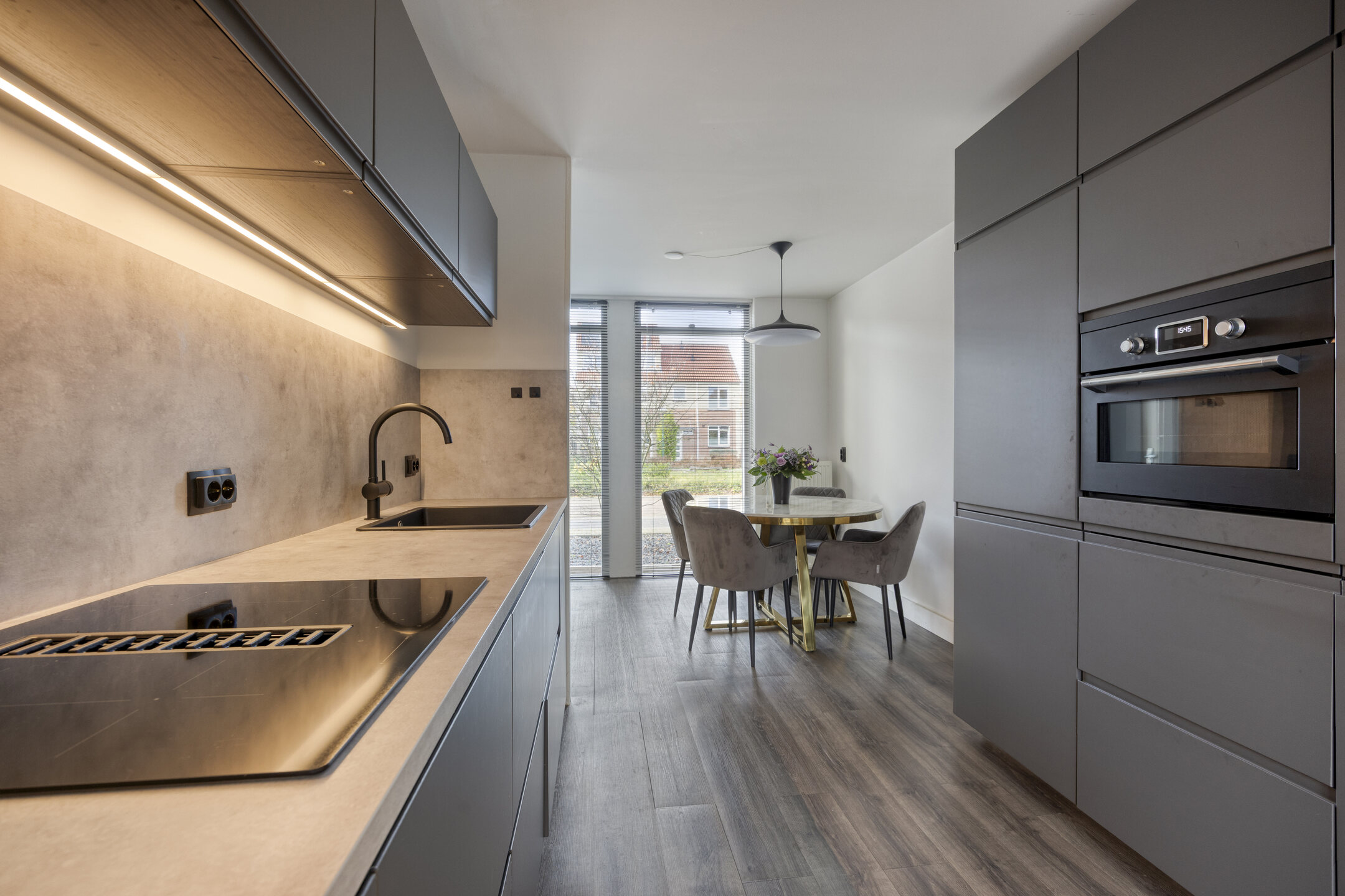 Het is een moderne, strakke keuken bestaande uit twee wandopstellingen voorzien van inbouwapparatuur. De kastenwand heeft een koelkast met vershoudlade, een vriezer, een combi-oven en volop bergruimte. In de opstelling met het aanrecht zit een vaatwasmachine en een inductiekookplaat met kookeilandafzuiging. Een set bovenkastjes zorgt voor nóg meer opbergruimte. Op alle keukenapperatuur zit nog garantie tot en met december 2027.