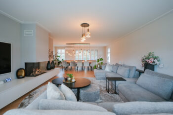De living is een heerlijke ruime, lichte en bovenal sfeervolle kamer waar comfort en stijl perfect samenkomen. De prachtige houten vloer, gelegd in een klassiek visgraatmotief en voorzien van vloerverwarming, zorgt voor een warme en luxe uitstraling. De strak gestucte wanden en plafonds met geïntegreerde spotverlichting geven de ruimte een moderne en verzorgde afwerking.
