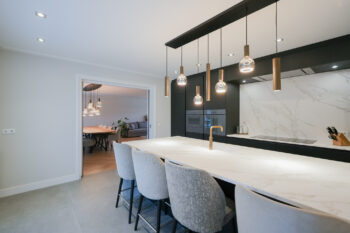 Daarnaast is het spoeleiland voorzien van een Quooker en spoelbak. Aan bergruimte geen gebrek in de grote lades en kasten. Aan het spoeleiland is er plaats voor 4 zitplaatsen. Een heerlijk plek voor het ontbijt met het gezin of u drinkt hier een glas wijn met vrienden terwijl u staat te koken. De keuken voorziet in 2 openslaande deuren richting de achtertuin zodat u in de zomerdag het terras makkelijk kan bedienen.