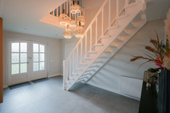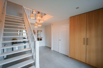 Bij binnenkomst wordt u verwelkomd in een royale ontvangsthal met een indrukwekkende vide, die direct een gevoel van ruimte en grandeur creëert. De hal is voorzien van een meterkast, een praktische garderobe nis en een fraaie hardhouten trappartij die op elegante wijze naar de eerste verdieping leidt. Deze stijlvolle entree vormt de perfecte binnenkomer van deze bijzondere woning.