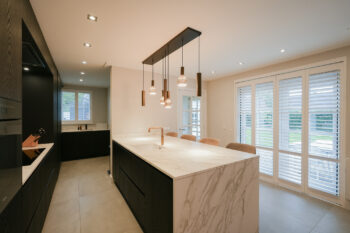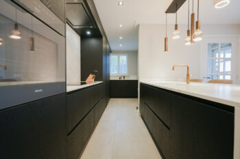 Vervolgens het spreekwoordelijk hart van de woning; de leefkeuken! De woonkamer en keuken zijn te scheiden middels de schuifdeuren. Echter door de ramen houdt u toch contact met elkaar. De op maat gemaakte keuken is net als de rest van de woning van topniveau. Er is alleen maar gebruik gemaakt van topmerken!