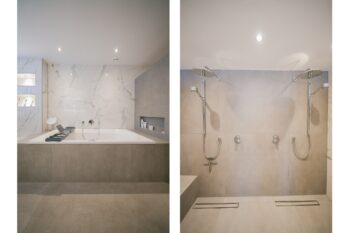 De prachtige badkamer is een ruimte waar u tot rust kunt komen. In het ligbad kunt u genieten van de bubbels of u loopt de in inloopdouche in waar u de beschikking heeft over 2 douches. Verder is er nog een toilet namelijk de douche WC Geberit, AquaClean Mera Classic en een dubbele wastafel met meubel en bijpassende spiegelkast. Het geheel ziet er subliem uit.