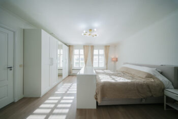 Aan de voorzijde van de woning bevindt zich de ruime en stijlvolle slaapkamer met een eigen badkamer en een serene uitstraling. De kamer is afgewerkt met een prachtige houten vloer, die is voorzien van comfortabele vloerverwarming voor een aangenaam binnenklimaat het hele jaar door. Daarnaast zorgt de