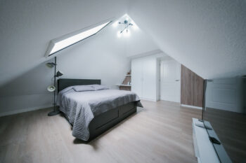 De zolder biedt volop ruimte voor het opbergen van uw spullen. U zou deze ruimte ook kunnen inrichten als werkkamer of voor een andere functie naar wens. De Vaillant cv-ketel en de omvormer van de zonnepanelen zijn hier geplaatst.