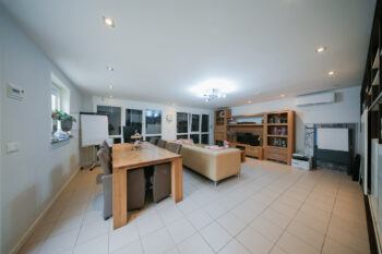De voormalige dubbele garage is omgevormd tot een tweede woonkamer of multifunctionele werkruimte. Dankzij de vele raampartijen geniet deze ruimte van een fijne natuurlijke lichtinval. De airconditioning zorgt zowel voor verkoeling als verwarming, waardoor het hier het hele jaar door aangenaam vertoeven is.