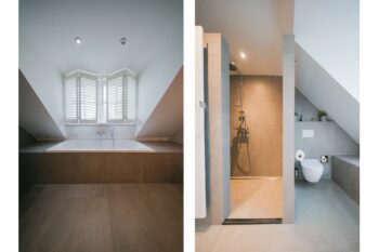 De badkamer op deze verdieping is te vergelijken met de badkamer op de begane grond. Ook hier treffen we ligbad welke prachtig onder de dakkapel is verwerkt, een inloopdouche, toilet en een dubbele wastafel met meubels en spiegelkast.