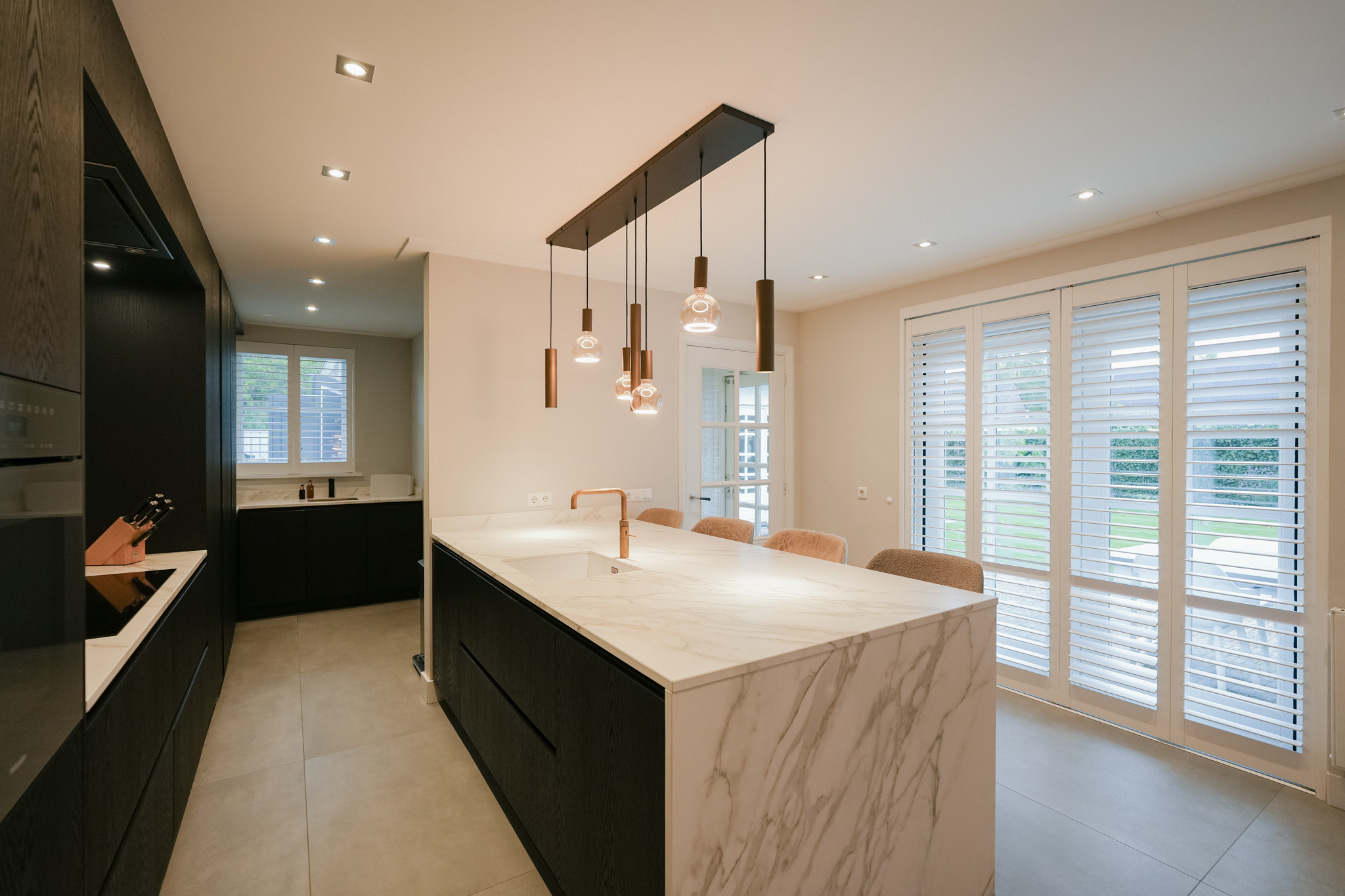 Daarnaast is het spoeleiland voorzien van een Quooker en spoelbak. Aan bergruimte geen gebrek in de grote lades en kasten. Aan het spoeleiland is er plaats voor 4 zitplaatsen. Een heerlijk plek voor het ontbijt met het gezin of u drinkt hier een glas wijn met vrienden terwijl u staat te koken. De keuken voorziet in 2 openslaande deuren richting de achtertuin zodat u in de zomerdag het terras makkelijk kan bedienen.