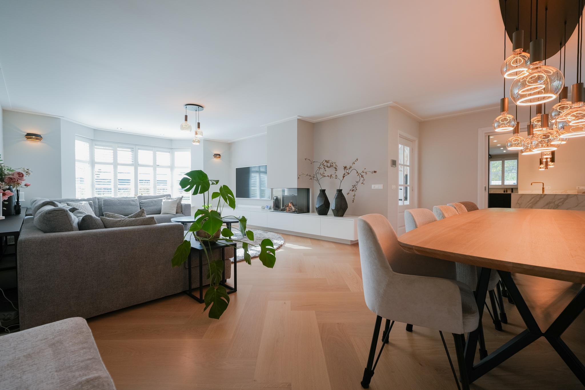 De living is een heerlijke ruime, lichte en bovenal sfeervolle kamer waar comfort en stijl perfect samenkomen. De prachtige houten vloer, gelegd in een klassiek visgraatmotief en voorzien van vloerverwarming, zorgt voor een warme en luxe uitstraling. De strak gestucte wanden en plafonds met geïntegreerde spotverlichting geven de ruimte een moderne en verzorgde afwerking.