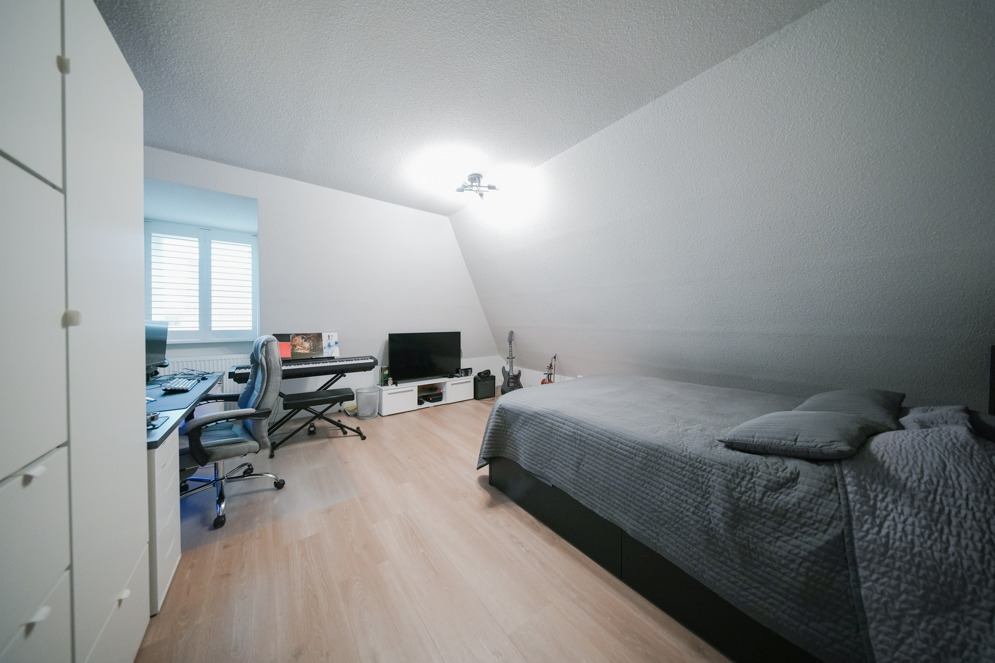 De zolder biedt volop ruimte voor het opbergen van uw spullen. U zou deze ruimte ook kunnen inrichten als werkkamer of voor een andere functie naar wens. De Vaillant cv-ketel en de omvormer van de zonnepanelen zijn hier geplaatst.