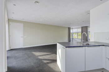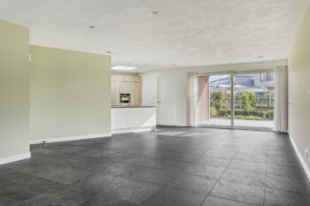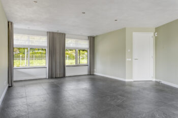 De grote, open woonkamer is licht en overzichtelijk ingedeeld. De brede ramen zorgen voor veel natuurlijk daglicht.