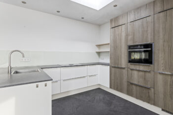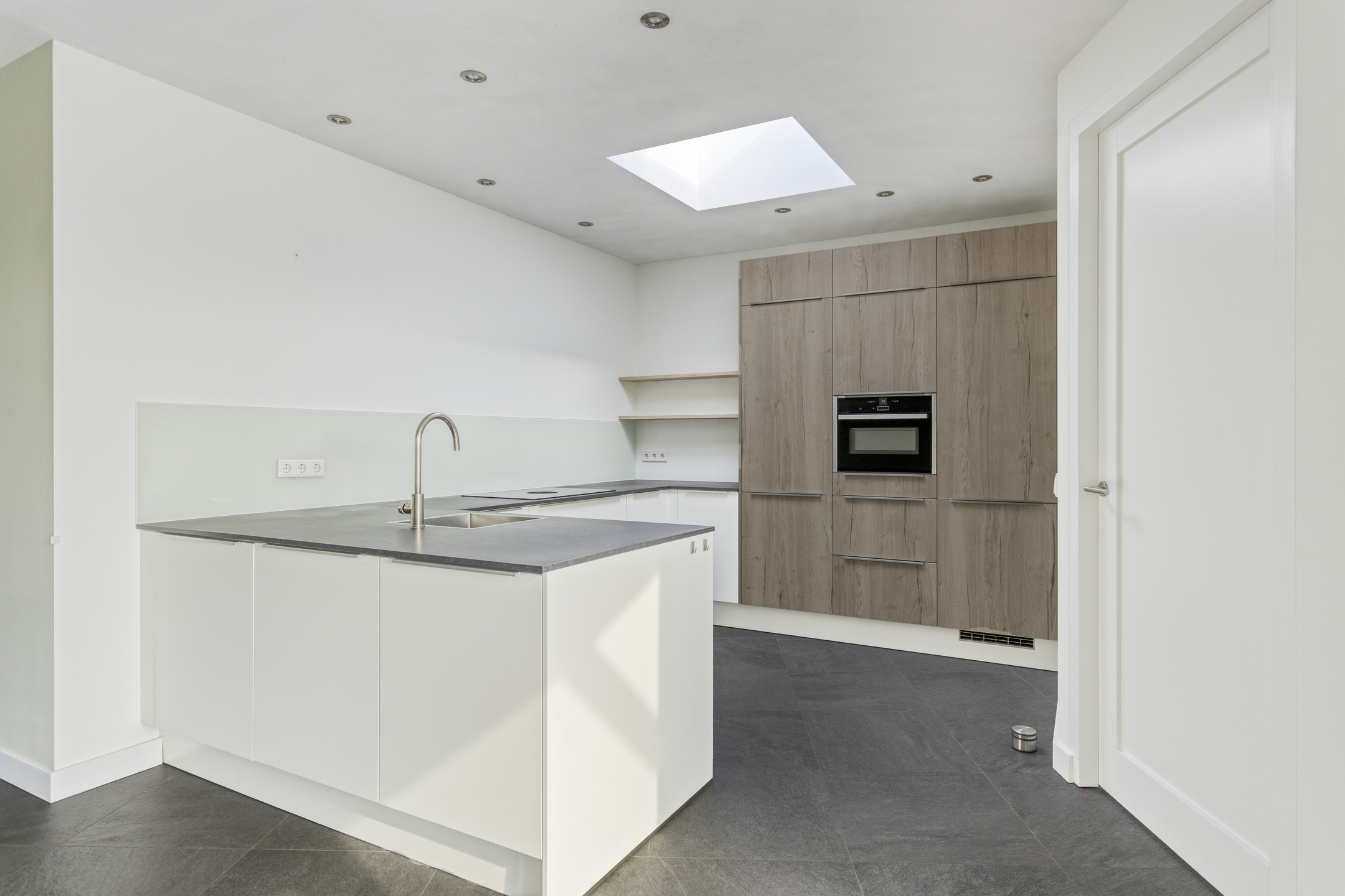 De keuken heeft een moderne en strakke uitstraling met een praktische indeling in U-vorm. De keuken is voorzien van hoogwaardige inbouwapparatuur, waaronder een kookplaat met geïntegreerde afzuiging en een combi-oven., vaatwasser en koelkast. Dankzij het grote werkblad en de vele opbergmogelijkheden is er volop ruimte om comfortabel te koken en op te bergen. Het dakraam zorgt bovendien voor extra daglicht, waardoor de keuken een prettige en lichte werkruimte is.