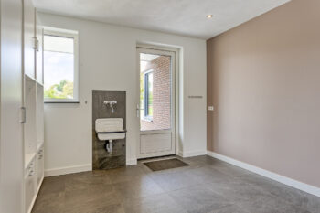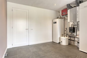 De woning beschikt over een royale, inpandige berging die meer is dan alleen een opslagruimte. Dankzij de aanwezige ramen geniet de ruimte van prettig daglicht, wat zorgt voor een fijne werkomgeving of hobbyruimte. Daarnaast is er een praktische wasmachineaansluiting aanwezig. Hier bevindt zich ook de technische installatie. Via de deur is er toegang tot de ruime tuin.