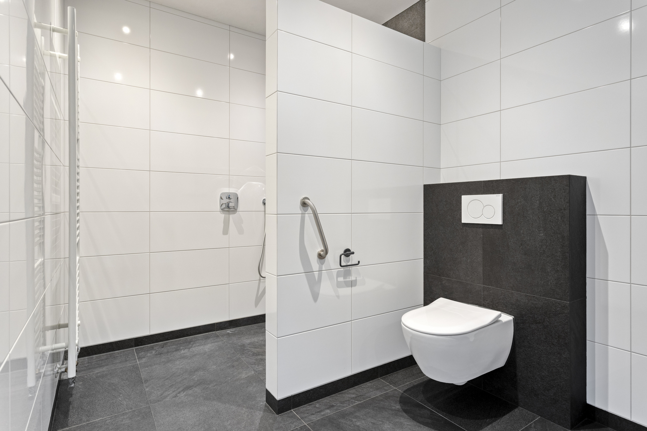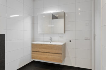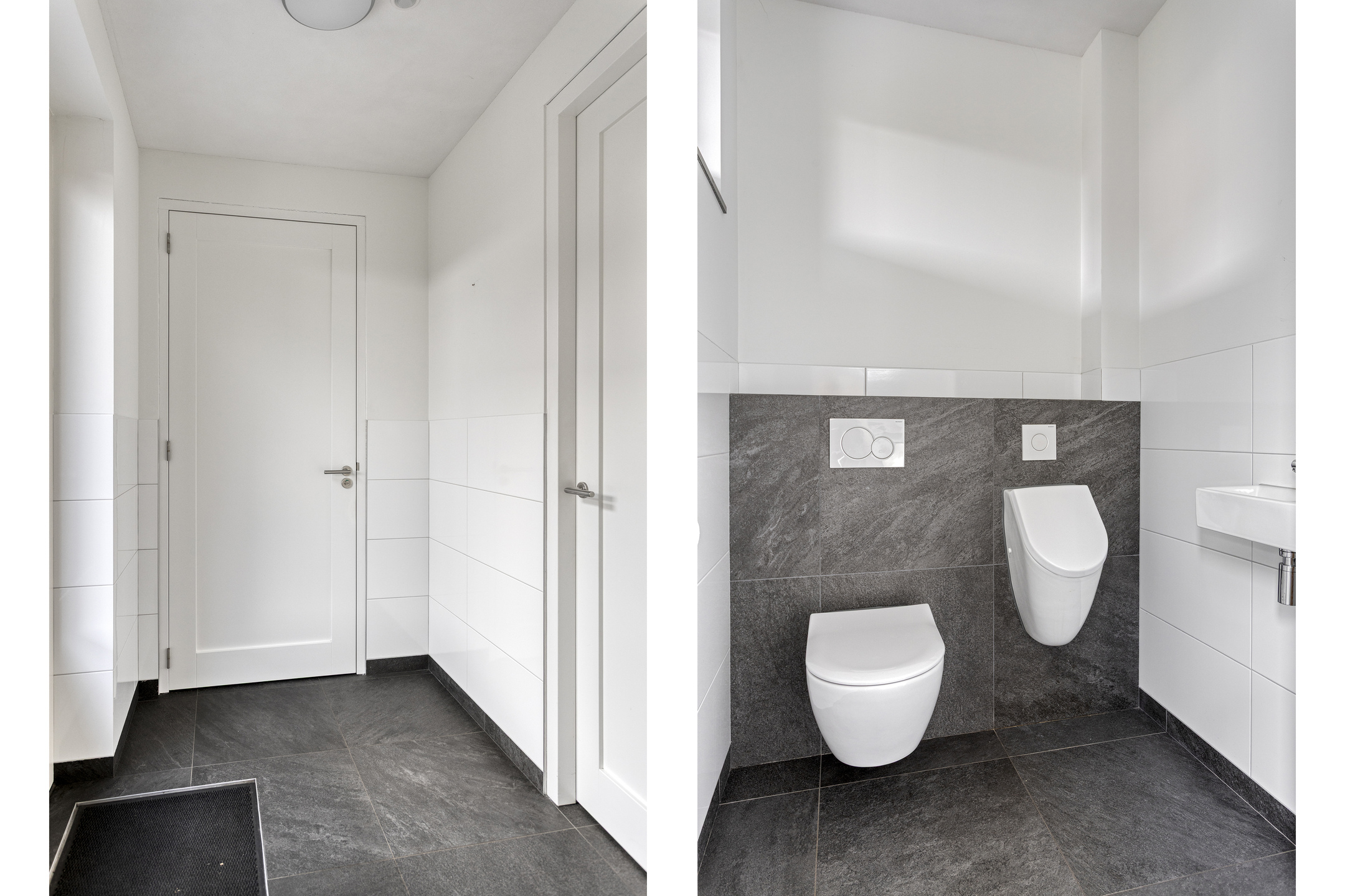 Via de woonkamer en de berging is het portaal bereikbaar. Vanuit hier is er toegang tot de toiletruimte en de achtertuin. De toiletruimte is modern afgewerkt en voorzien van een wandcloset, urinoir en fonteintje.