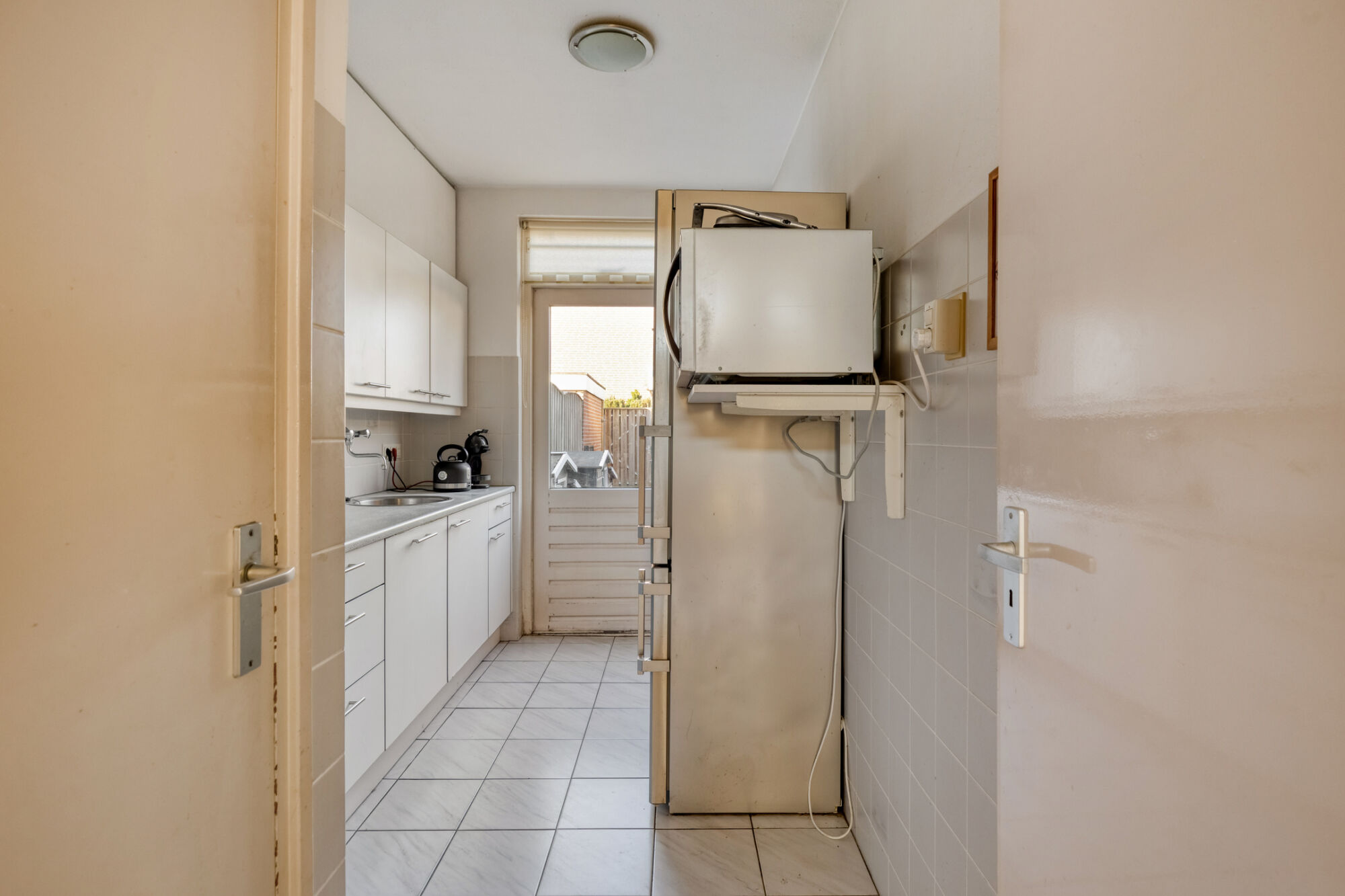 Keuken met een nette inrichting in wandopstelling, voorzien van volop kastruimte, een inbouwgaskookplaat, inbouw vaatwasser (2025) en een afzuigkap. Daarnaast beschikt de keuken over een praktische trapkast, ideaal voor het opbergen van uw voorraad. Het dak is vernieuwd in 2025.