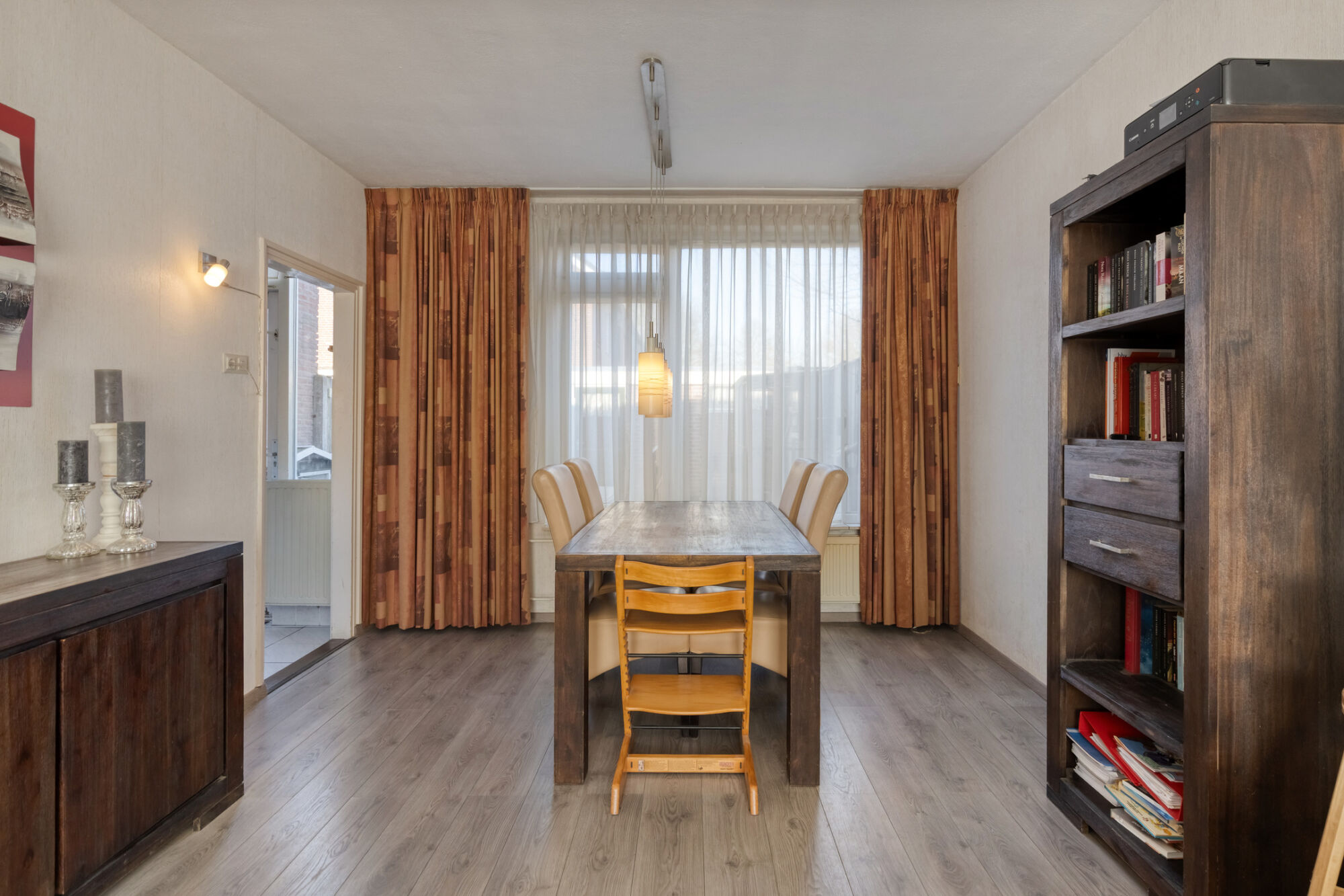 Sfeervolle doorzonwoonkamer met laminaatvloer. Dankzij de grote raampartijen geniet de ruimte van veel natuurlijk licht, wat zorgt voor een ruimtelijk en open karakter.