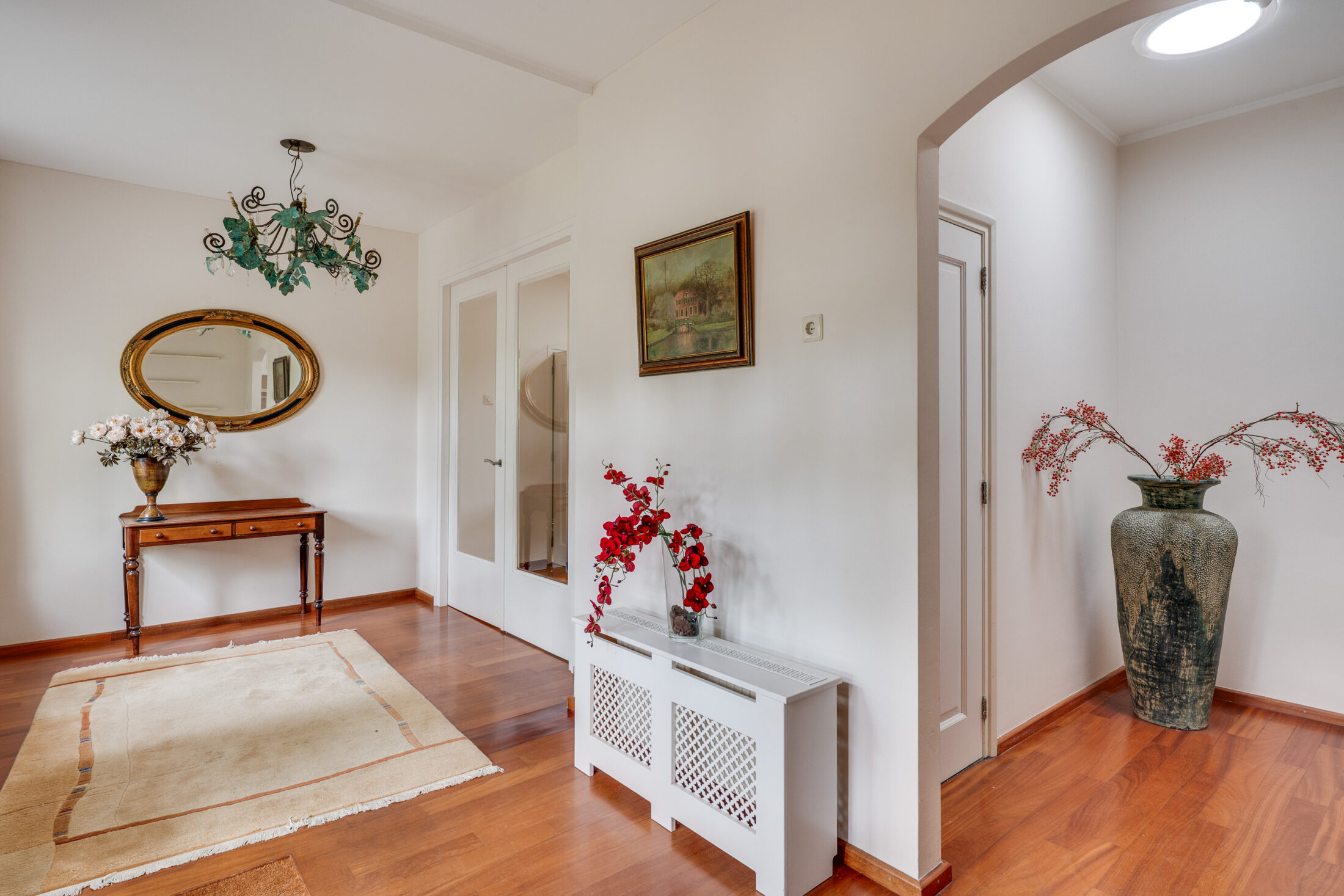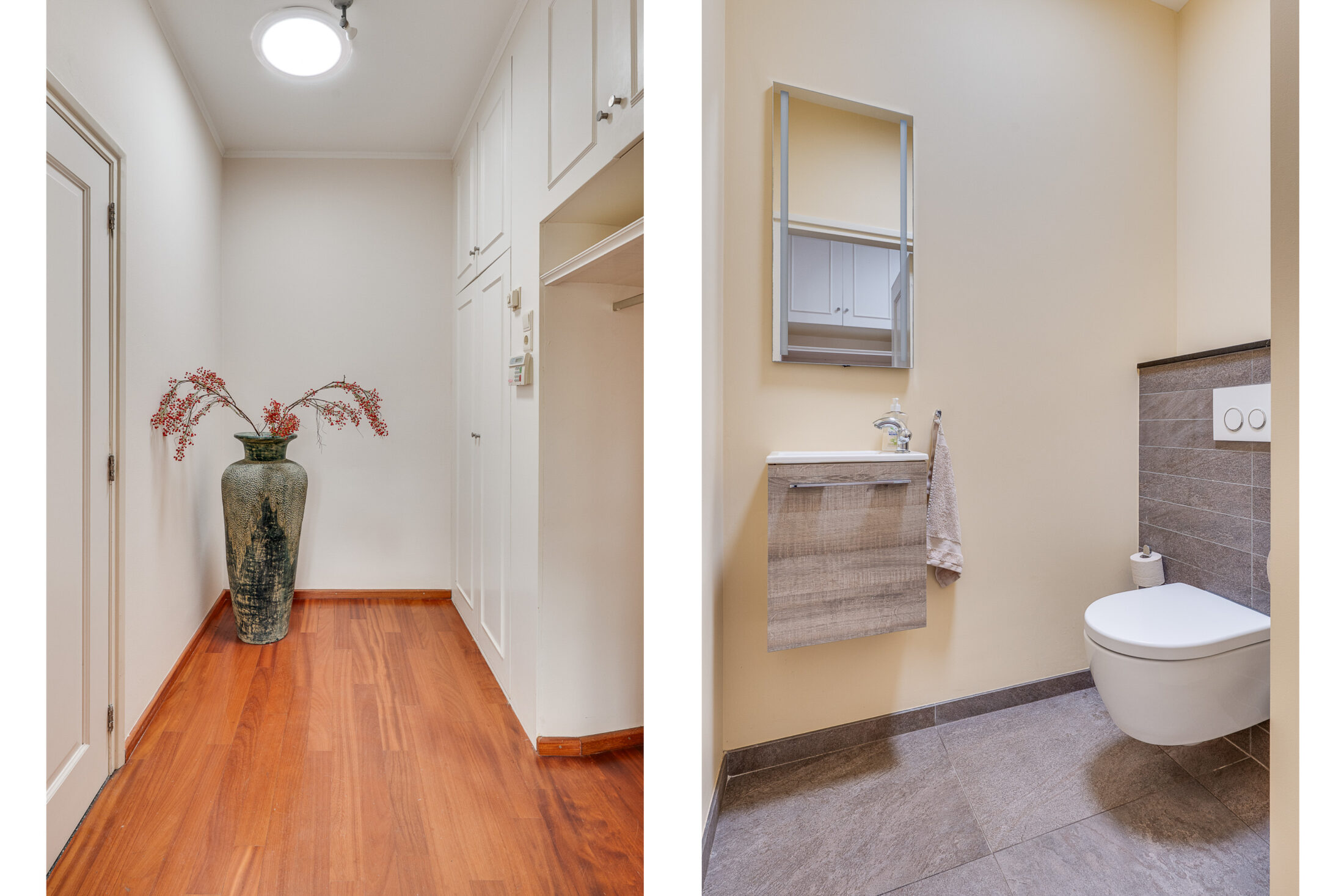 Voorentree met toegang tot de centrale hal. In de hal bevindt zich een garderobe en de moderne toiletruimte met een wandcloset en fonteintje.