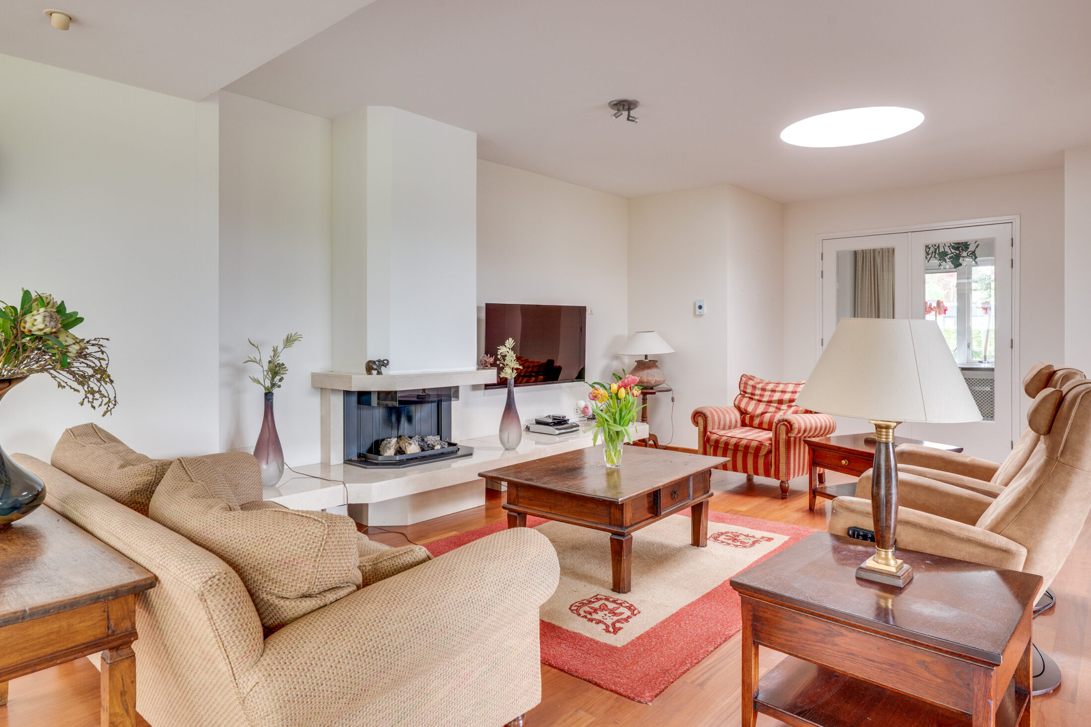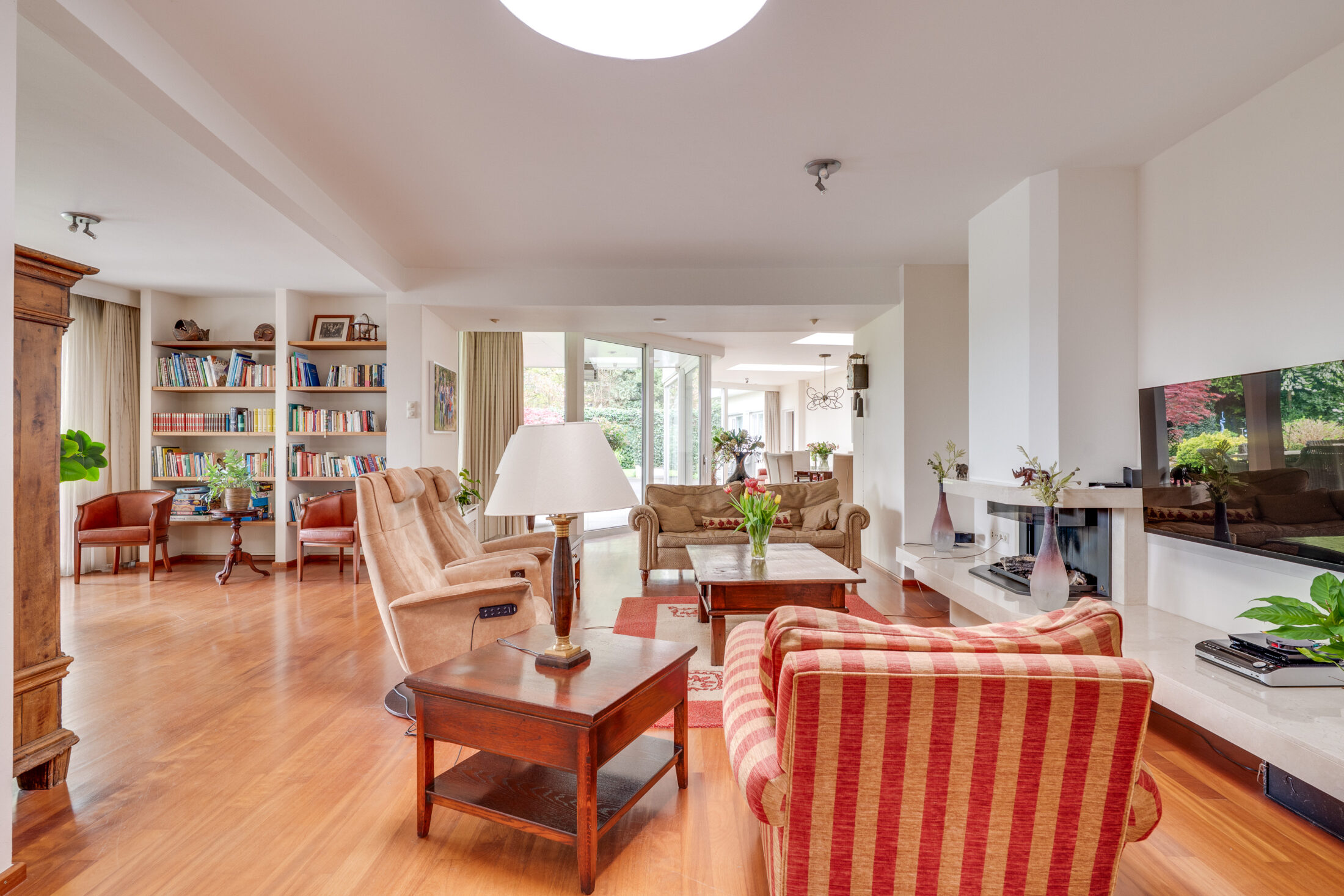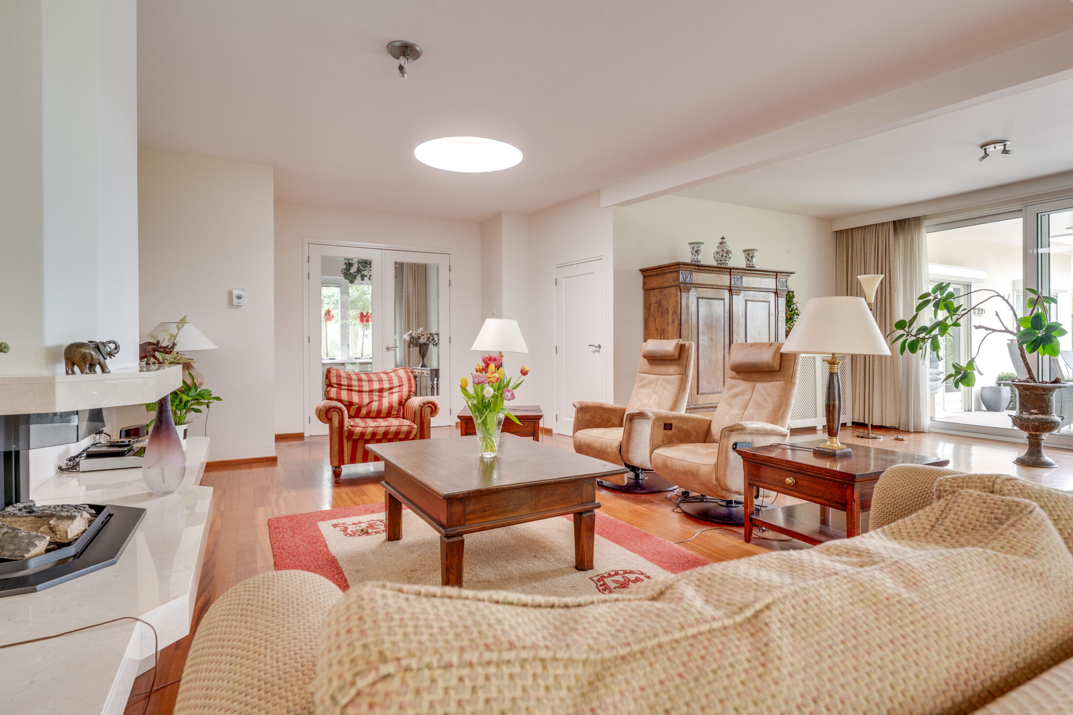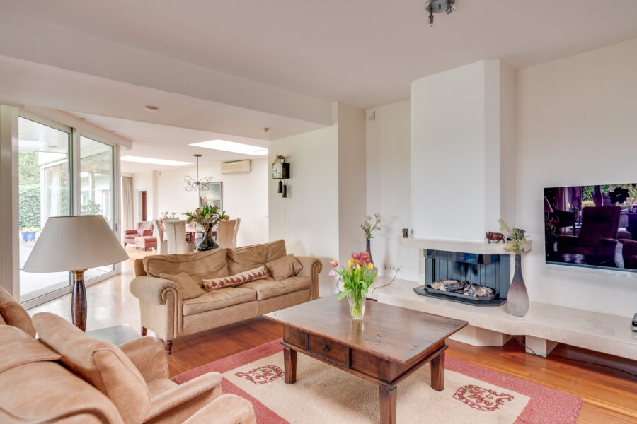 Dubbele deuren geven toegang tot de riante woonkamer. De woonkamer is verdeeld in een zitgedeelte, woongedeelte en een eetgedeelte. De aanwezigheid van een gashaard draagt bij aan het sfeervolle geheel. Er is zeer veel lichtinval en daarnaast zorgen de grote raampartijen (grote schuifpuien) voor een optimaal contact met de tuin. Vanuit de woonkamer naar Slaapgedeelte I.