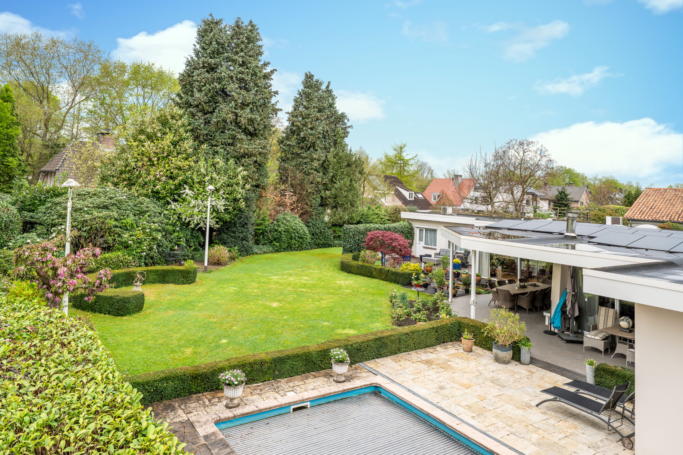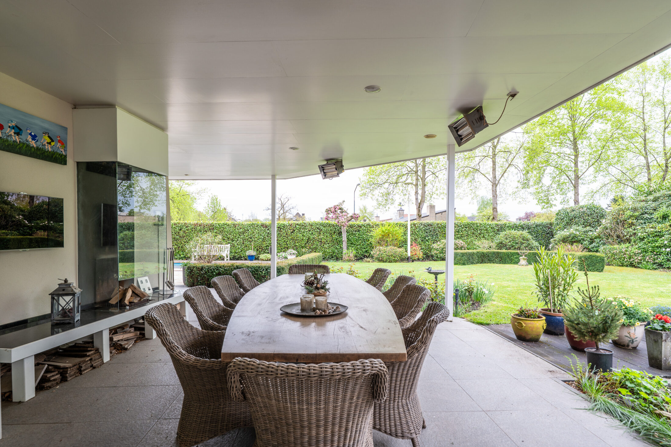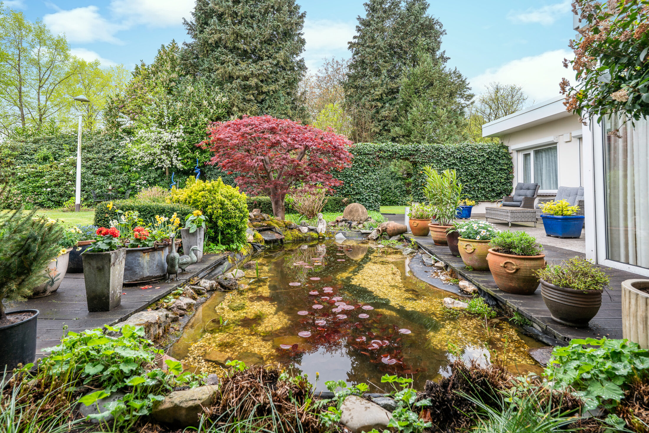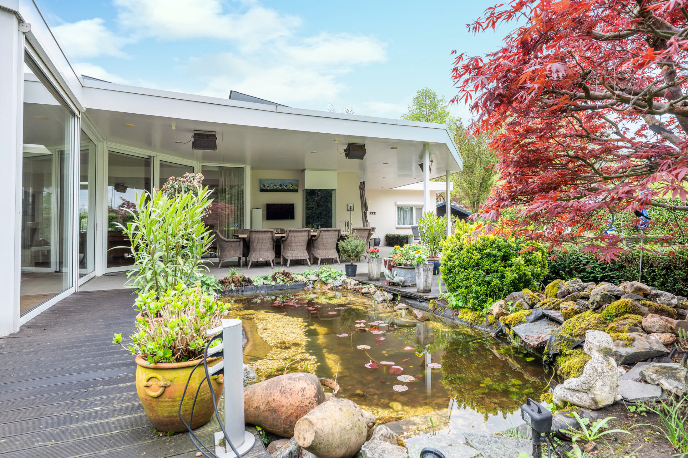 Prachtige en volop privacy biedende tuin met groot overdekt terras (60 m2!); volop vaste beplanting, grasperk, een vijverpartij en een zwembad. Het overdekte terras is voorzien van een eigen haard en heaters zodat u gedurende het geheel jaar kunt genieten van uw fantastische tuin. De inrichting van de tuin met o.a. een zwembad in combinatie met de zeer fraaie volwassen beplanting geven een groot gevoel van privacy en vrijheid en laten u genieten van uw eigen buitenparadijs!