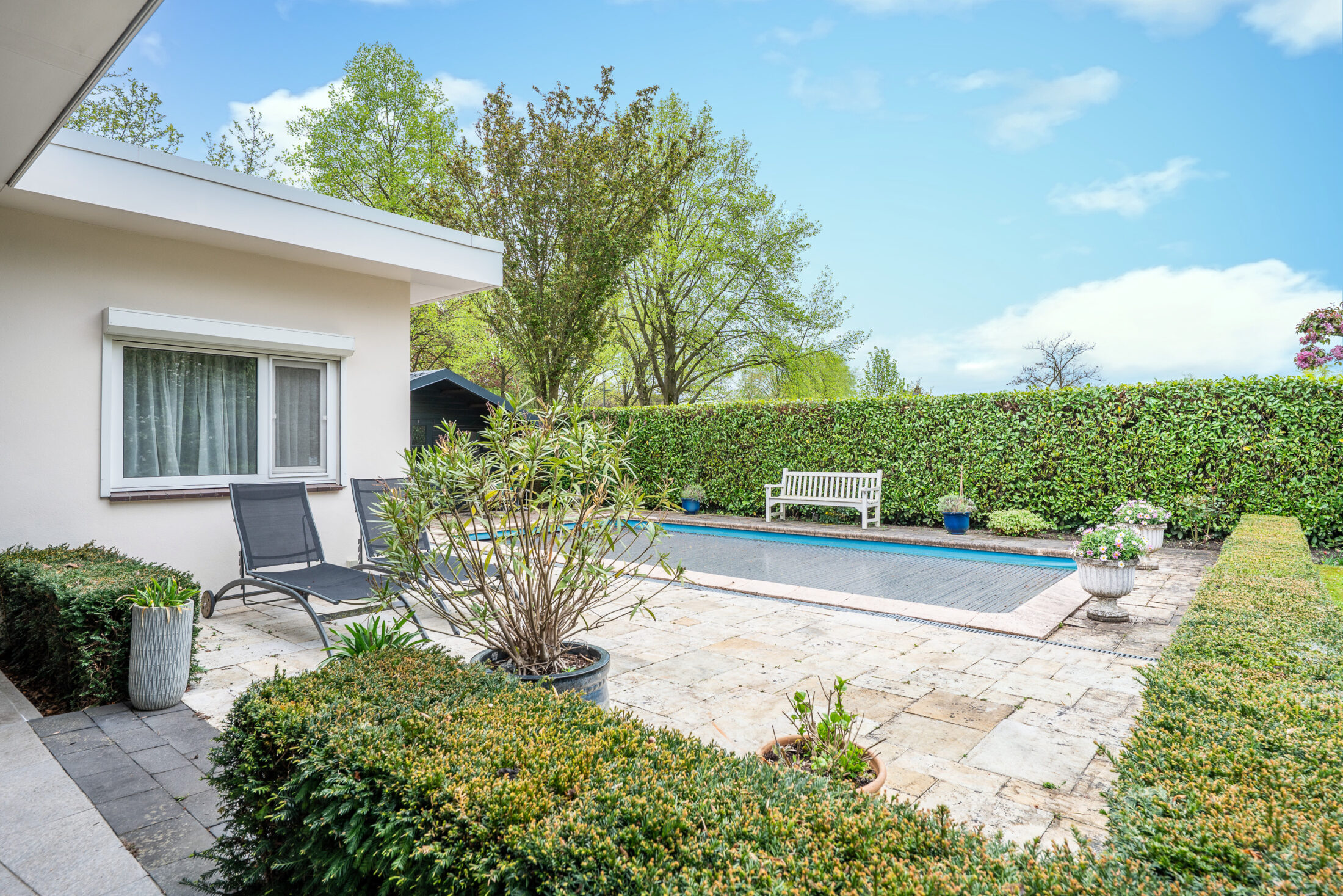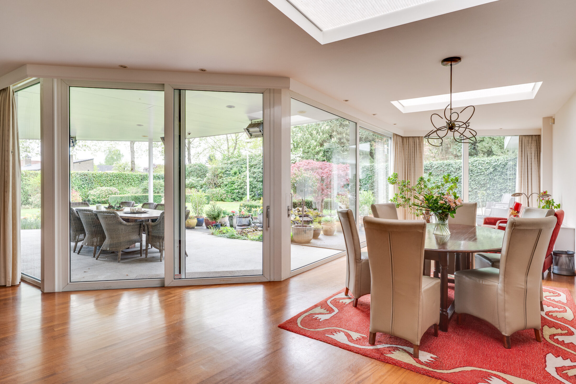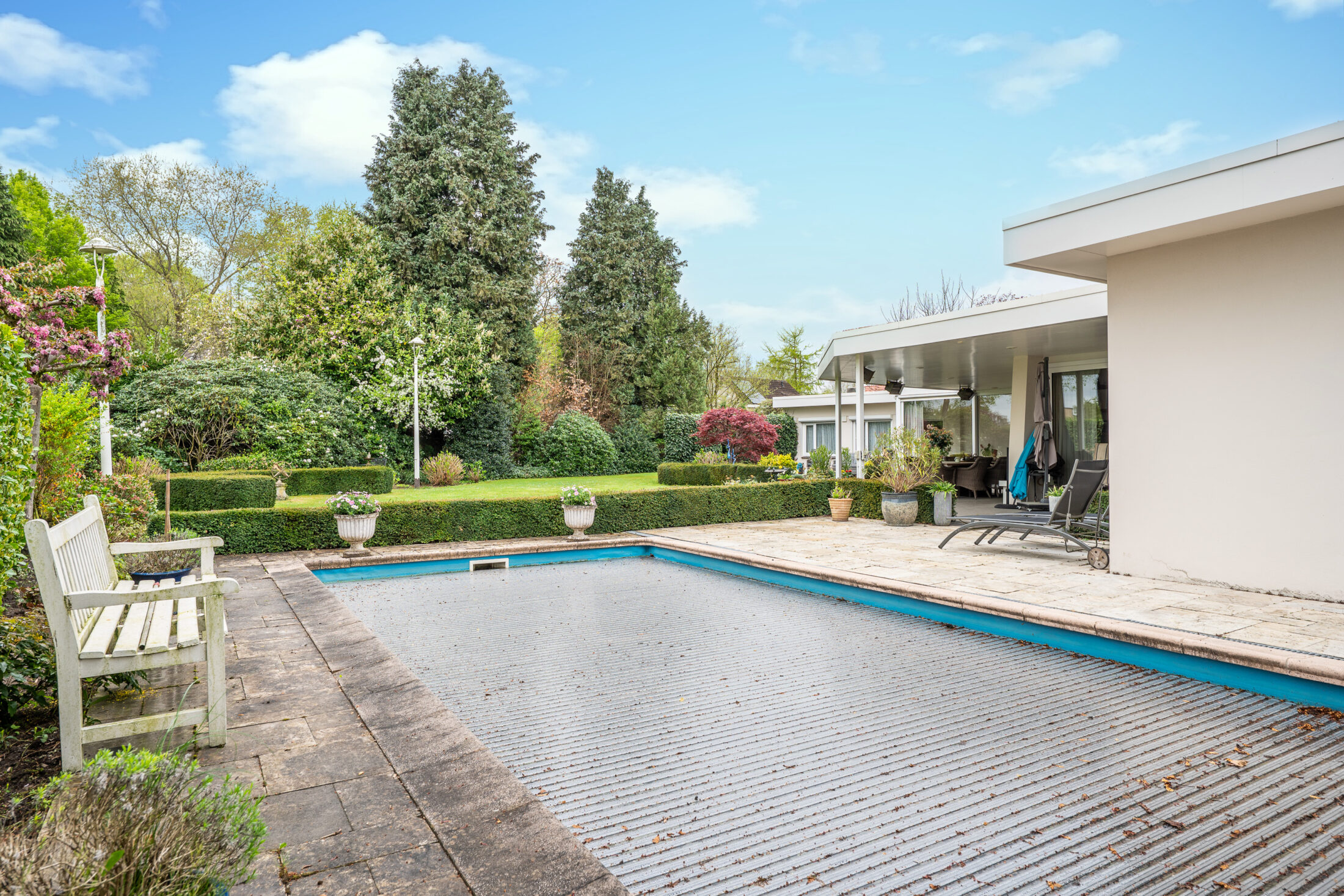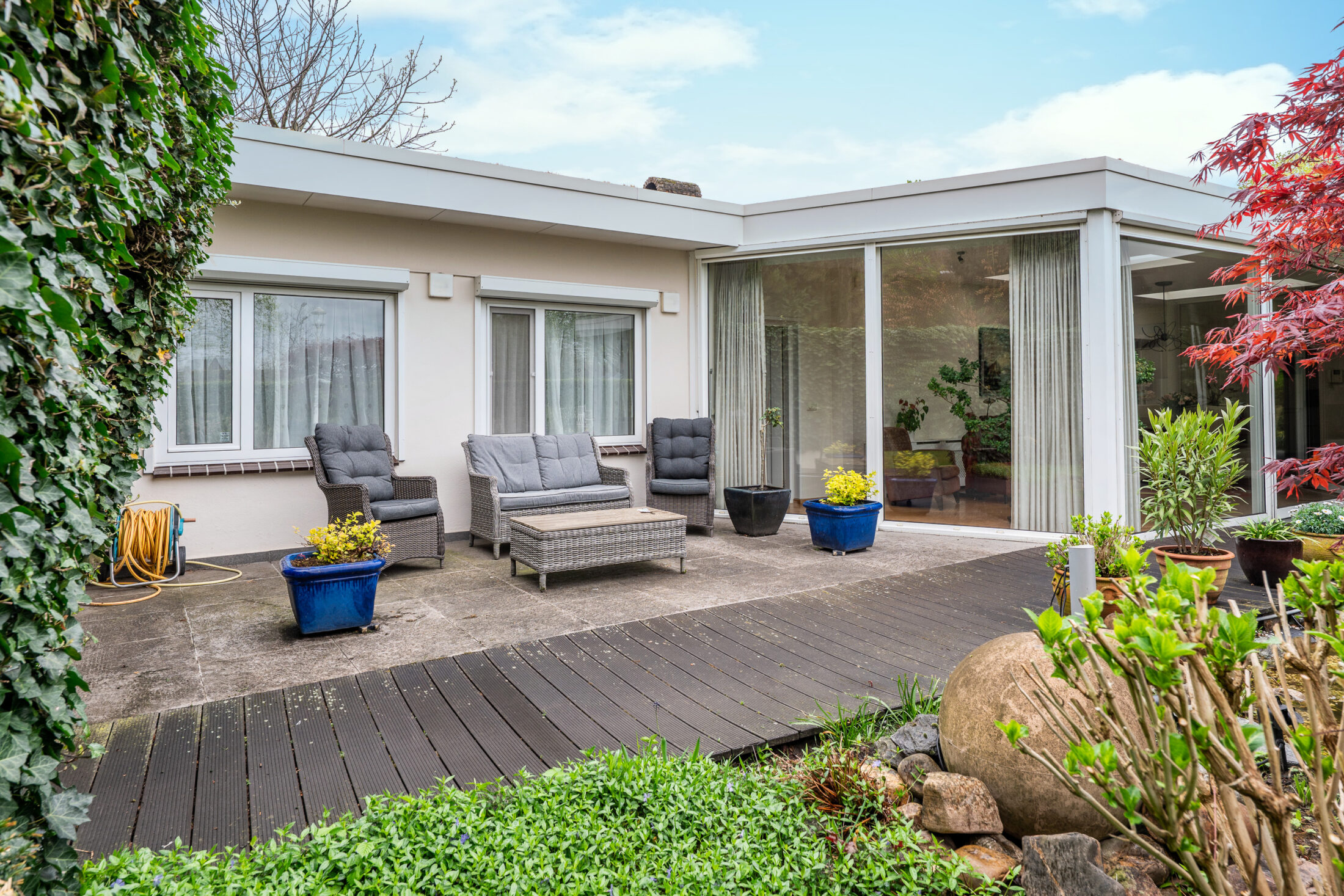 Prachtige en volop privacy biedende tuin met groot overdekt terras (60 m2!); volop vaste beplanting, grasperk, een vijverpartij en een zwembad. Het overdekte terras is voorzien van een eigen haard en heaters zodat u gedurende het geheel jaar kunt genieten van uw fantastische tuin. De inrichting van de tuin met o.a. een zwembad in combinatie met de zeer fraaie volwassen beplanting geven een groot gevoel van privacy en vrijheid en laten u genieten van uw eigen buitenparadijs!