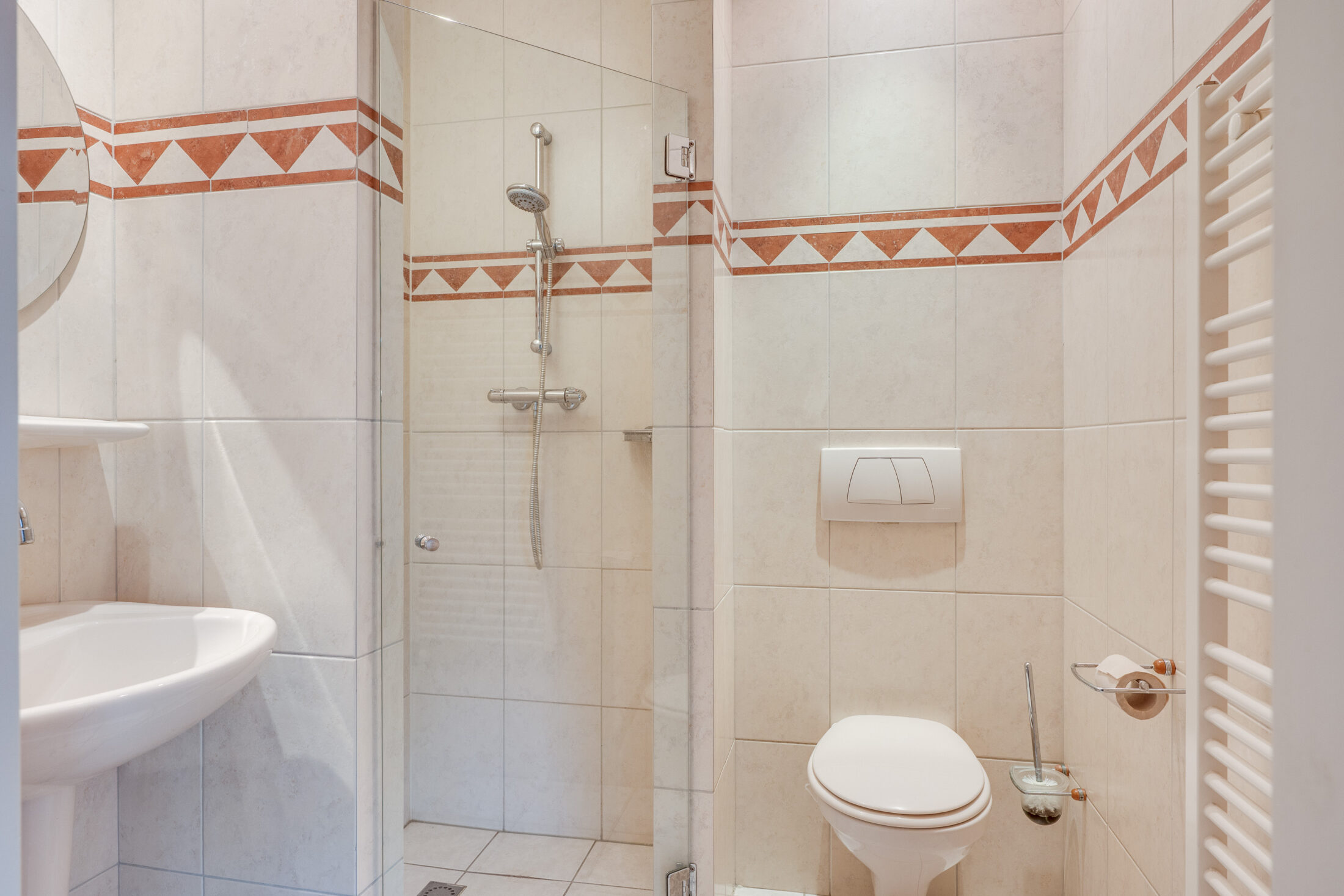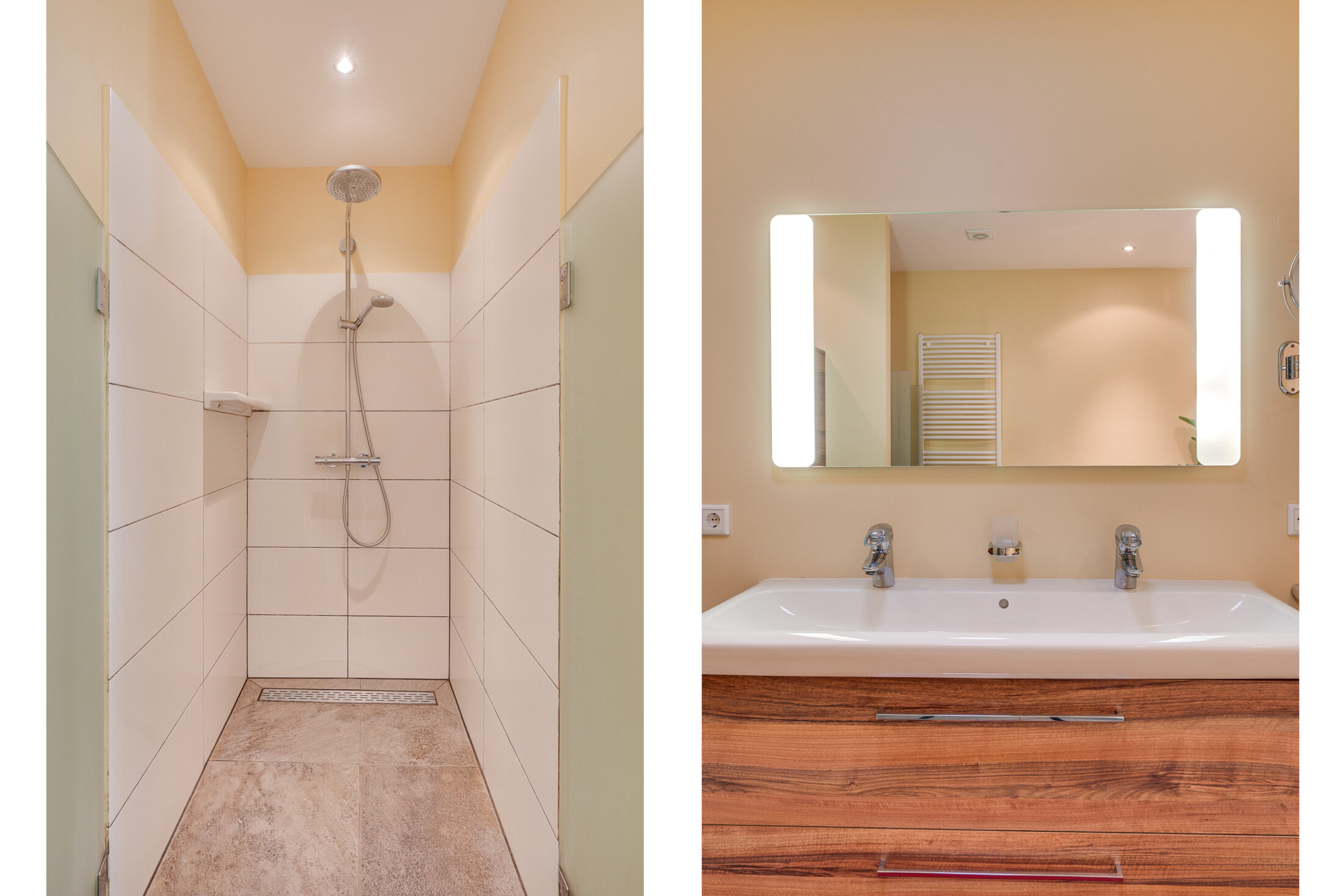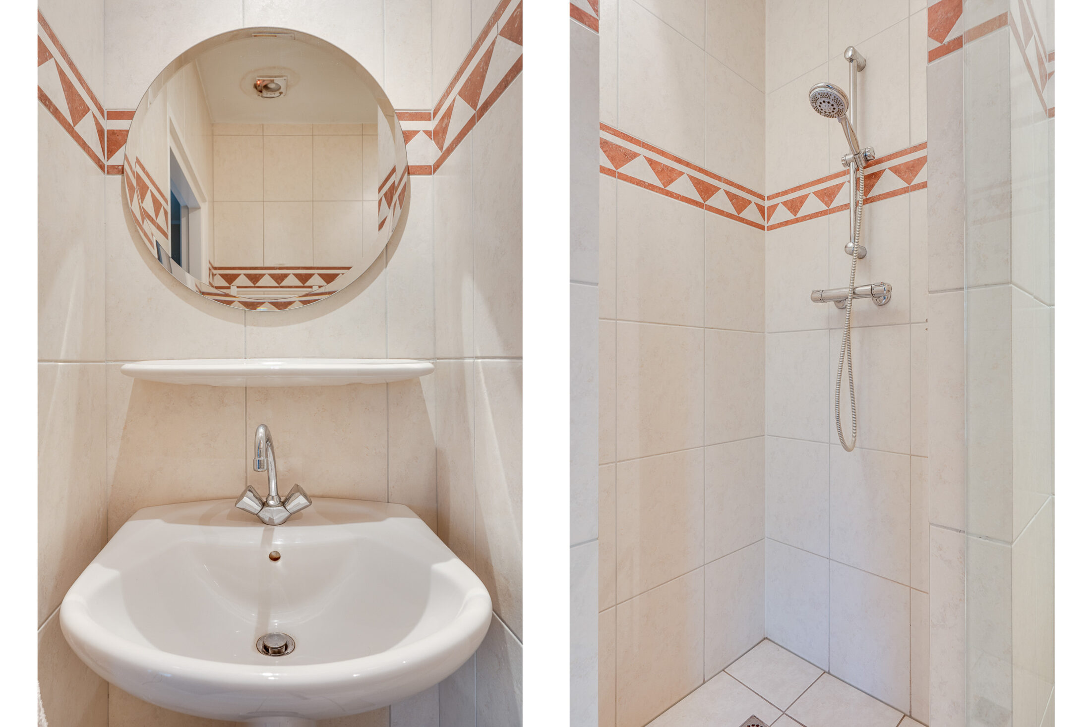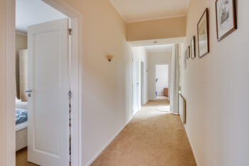 Corridor waaraan gelegen 3 ruime slaapkamers ( resp. 14,4; 9,7 en 10,7 m2) en een geheel betegelde badkamer met inloopdouche, toilet en wastafel.