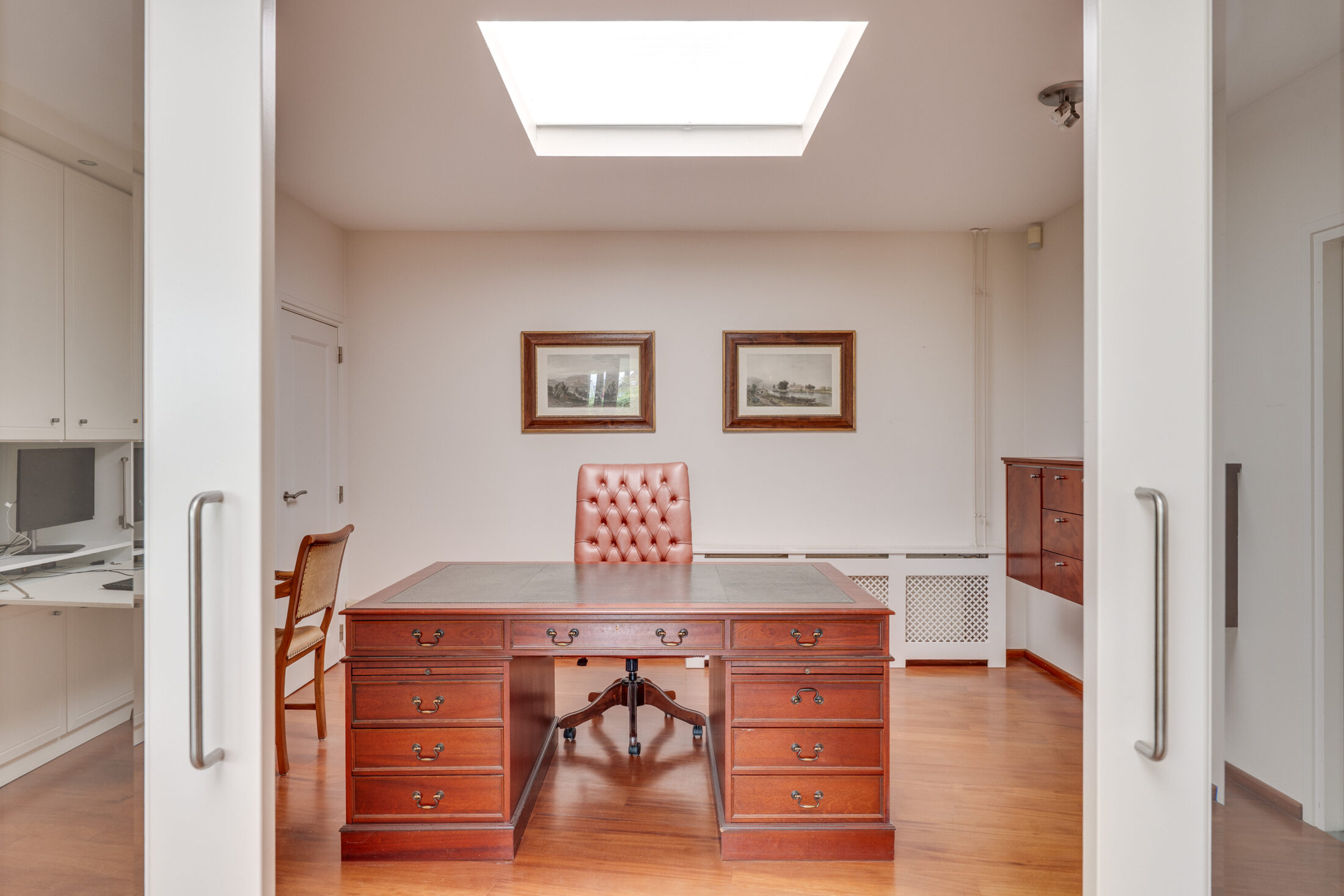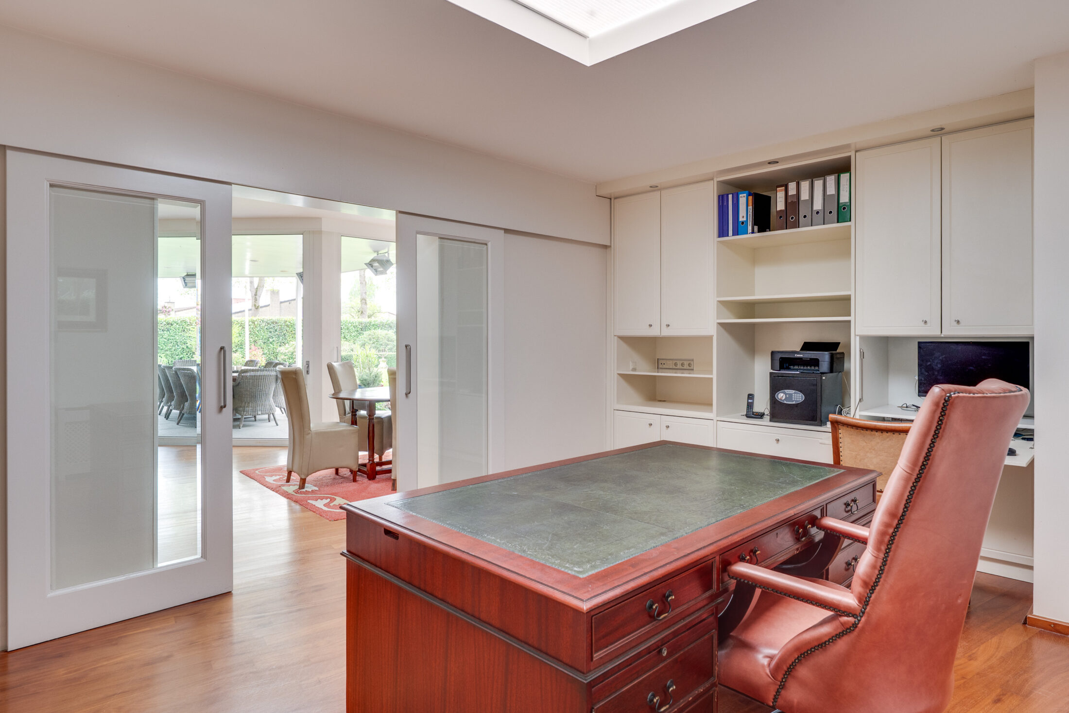 De study is een fantastische extra multifunctionele ruimte die voor diverse doeleinden geschikt is. Denk hierbij een kantoor; chill-ruimte; tv-kamer en/of hobbyruimte. Een grote kastenwand zorgt voor flink wat opslagmogelijkheden.