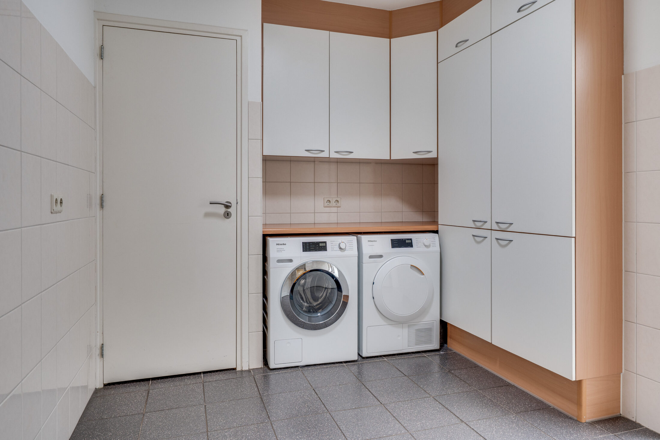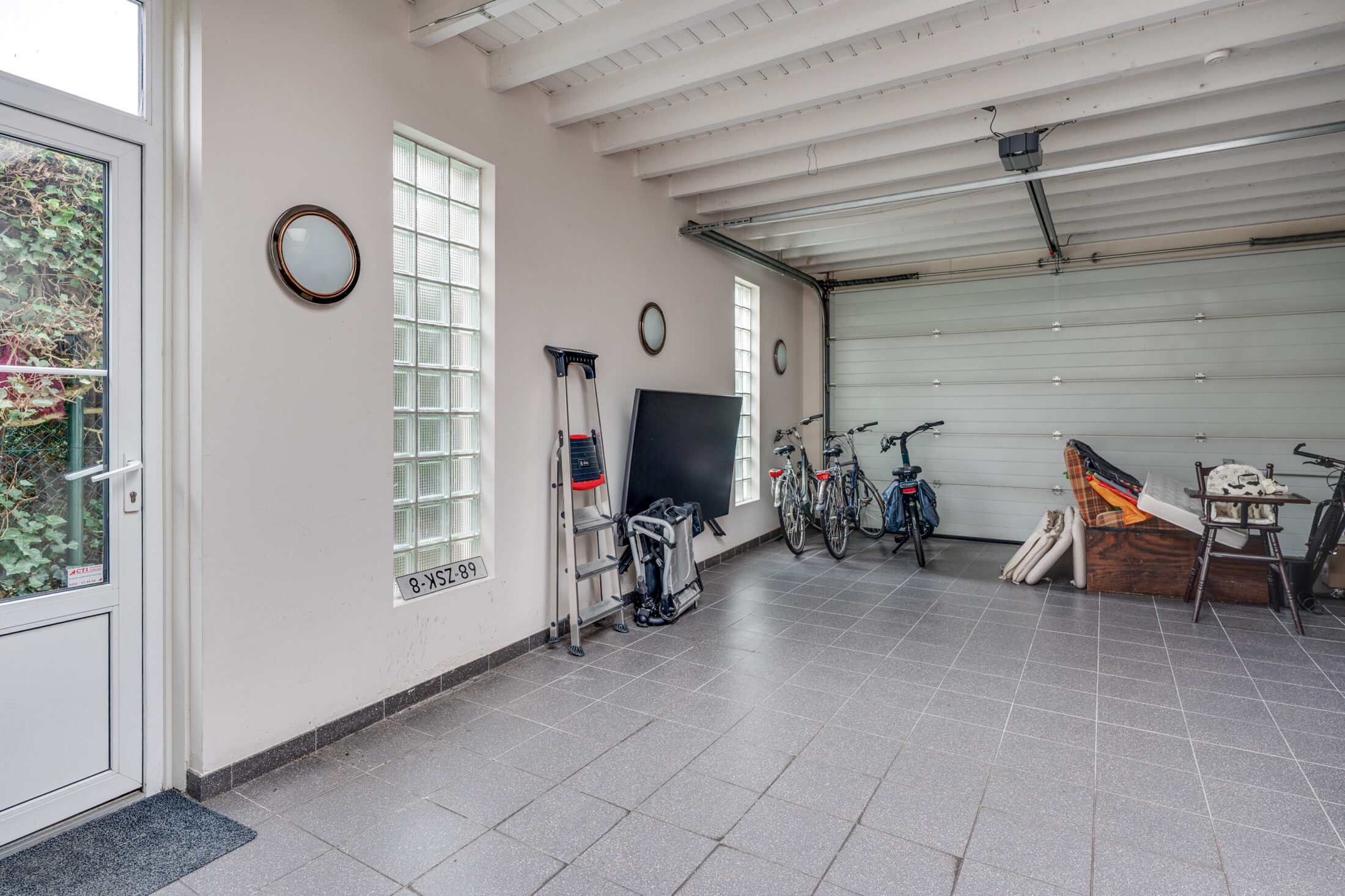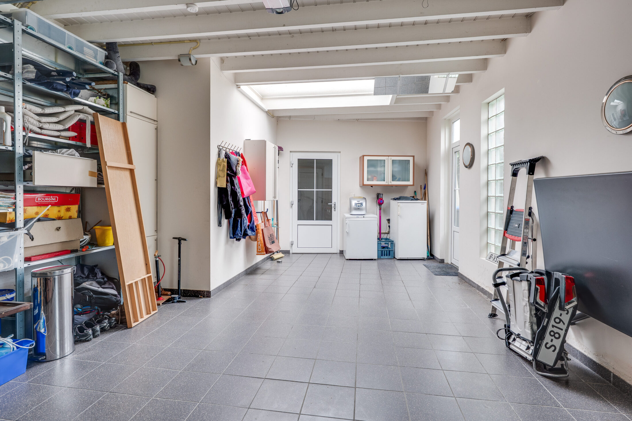 Bijkeuken/wasruimte met aansluitingen voor de wasapparatuur en extra bergruimte. Inpandige garage met tegelvloer en grote elektrische kanteldeur.