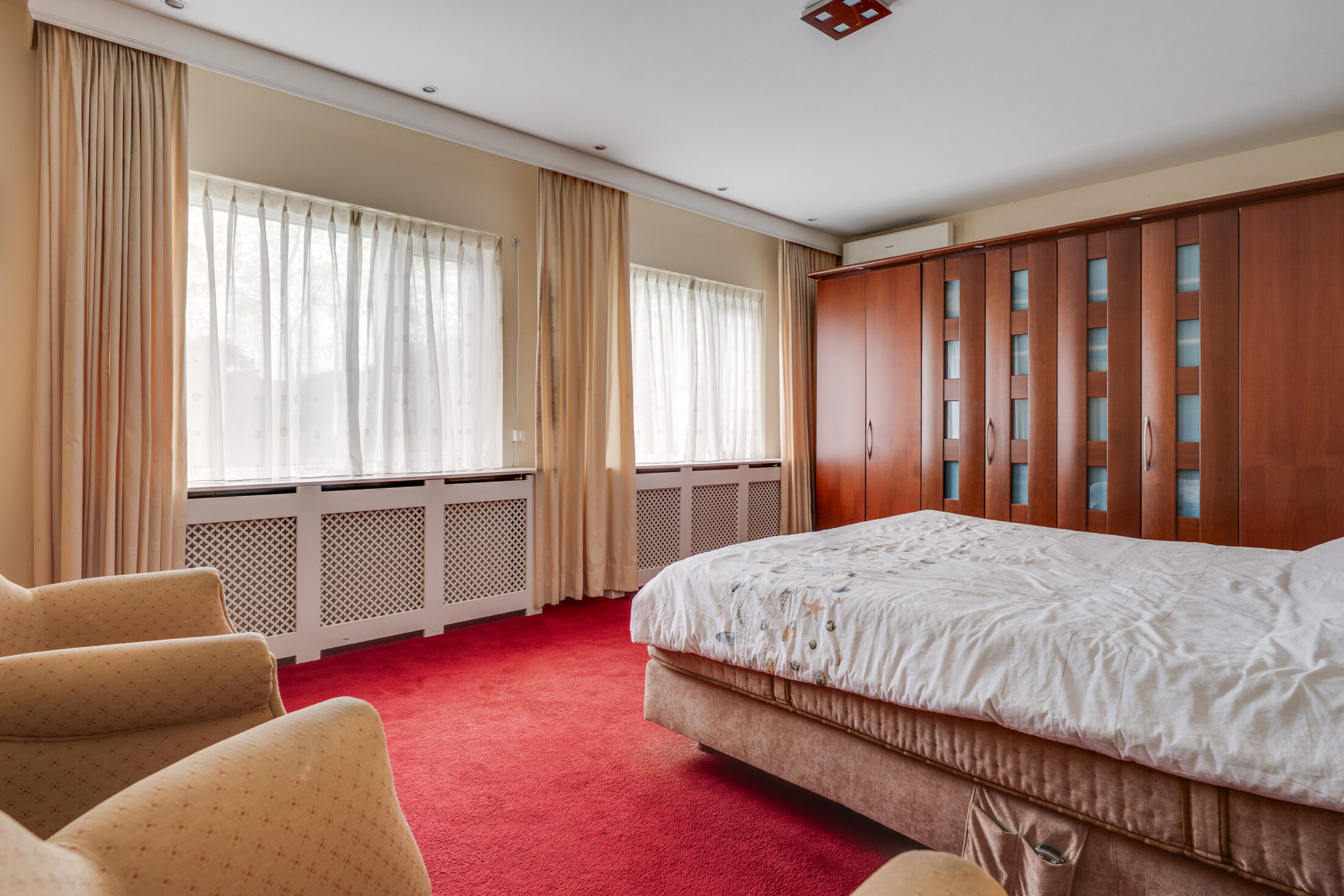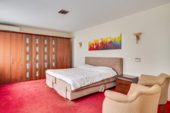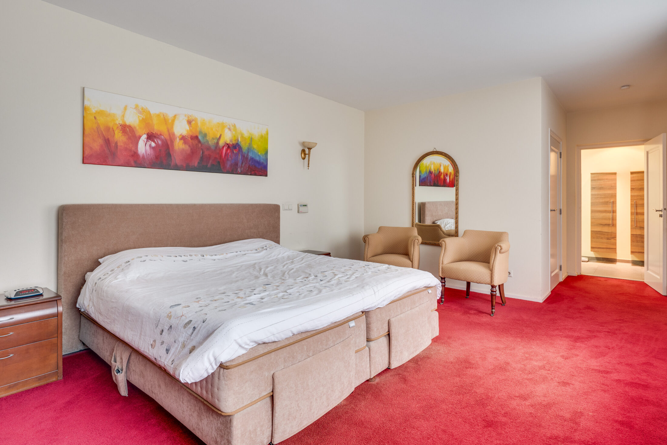 Vanuit de eetkamer heeft u toegang tot de fantastische privévleugel. U vindt hier een zeer ruime slaapkamer van maar liefst 26 m2; een eigen inloopkast en een luxe badkamer met een badmeubel met dubbele wastafel; een ligbad, een wandcloset en een grote inloopdouche.