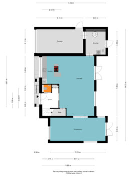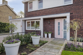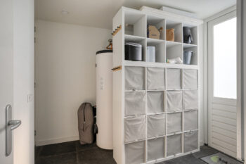 Aan de andere zijde van de woning zijn de praktische bijkeuken en de inpandige garage gesitueerd. De garage is voorzien van een elektrische roldeur én een 360V-aansluiting, ideaal voor het opladen van een elektrische auto. Ook is hier de aansluiting voor de wasmachine en droger aanwezig.