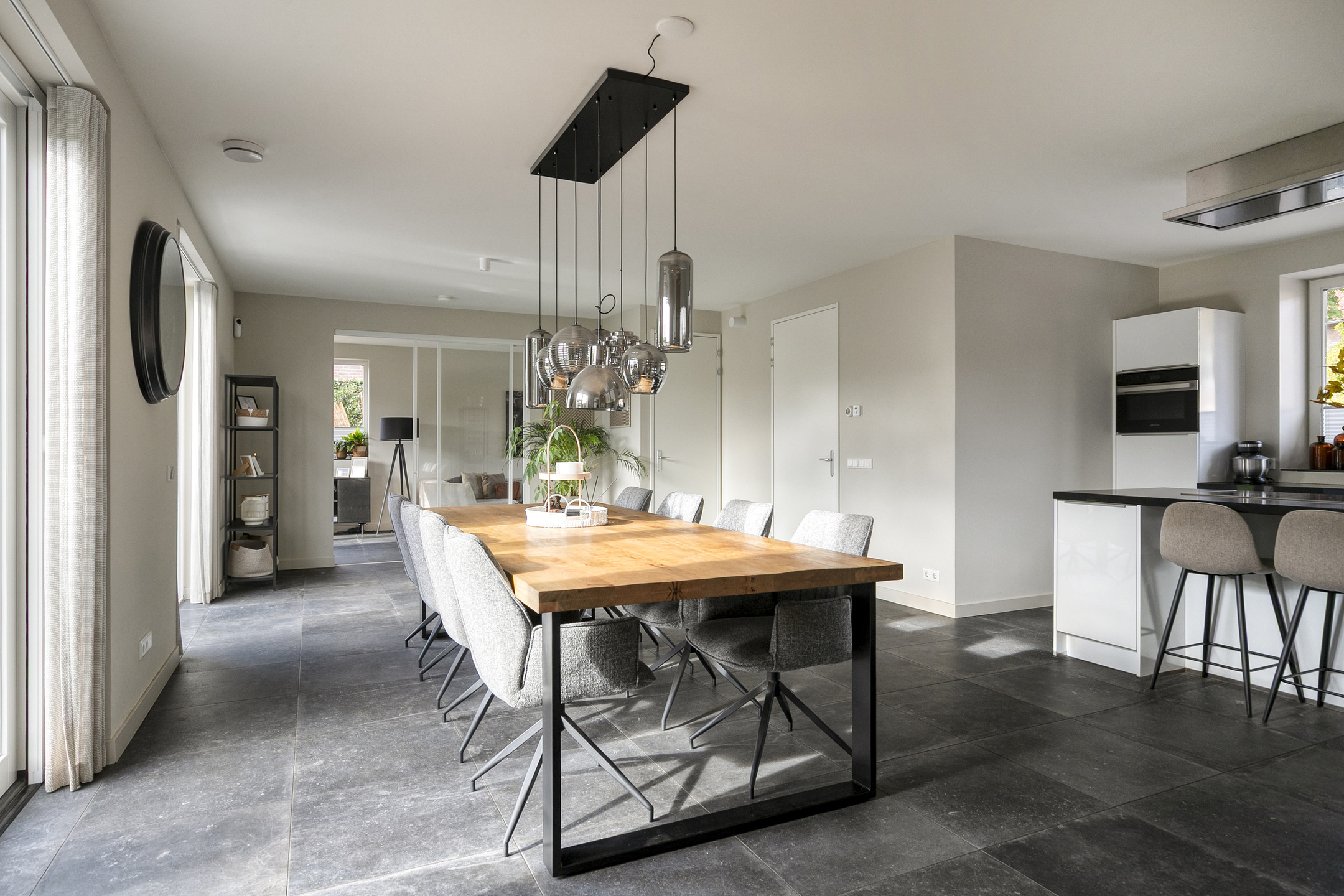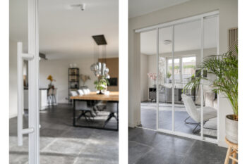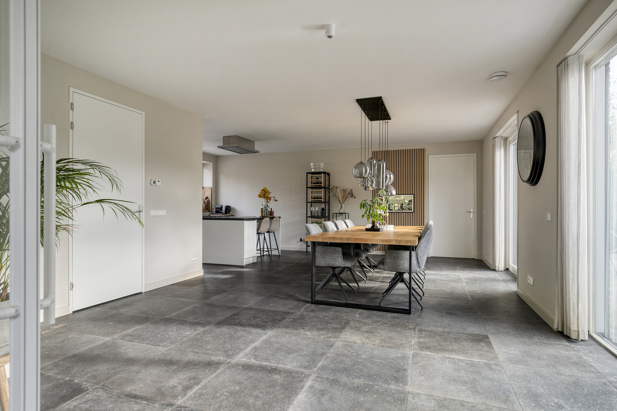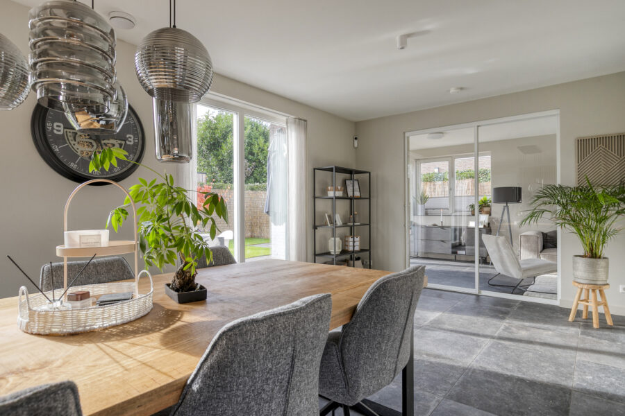De ruime woonkeuken en woonkamer vloeien naadloos in elkaar over dankzij de stijlvolle stalen schuifdeur. De openslaande deuren vanuit zowel de keuken als de woonkamer zorgen bovendien voor een directe verbinding met de tuin, waardoor binnen en buiten één geheel vormen. Momenteel is de indeling gekozen met een royale woonkeuken en een aparte woonkamer.