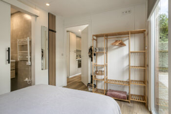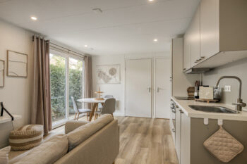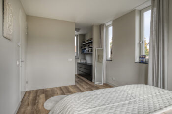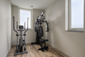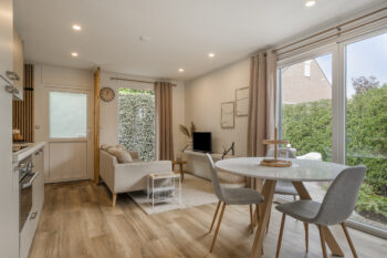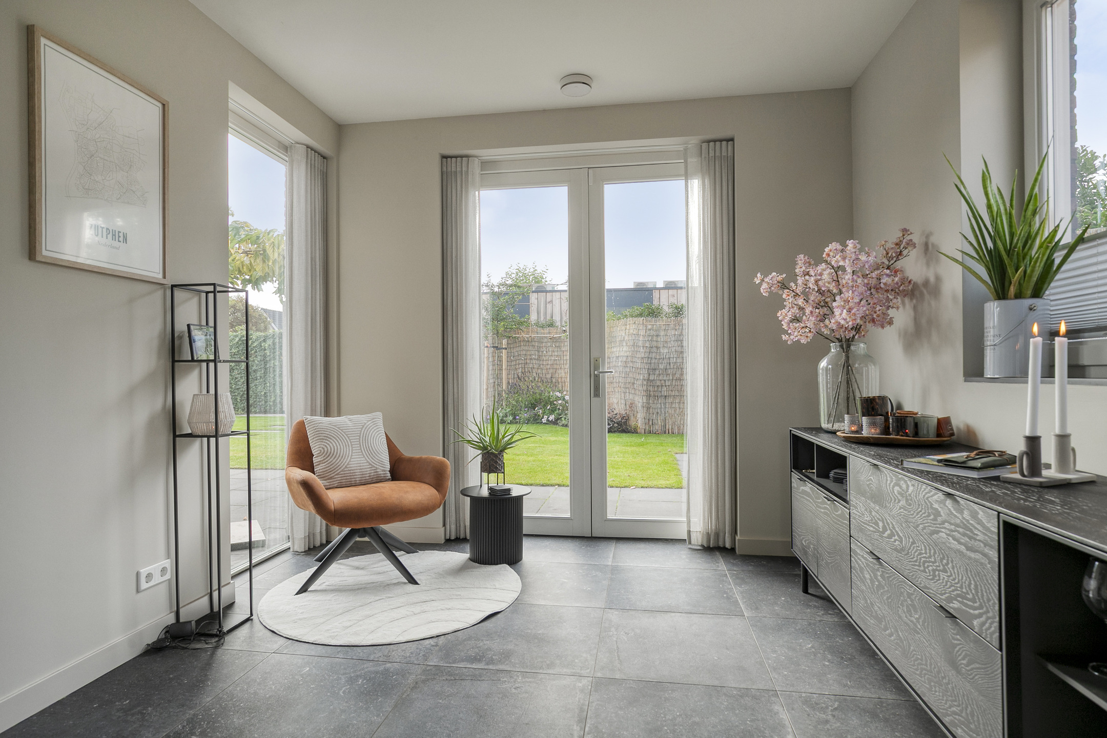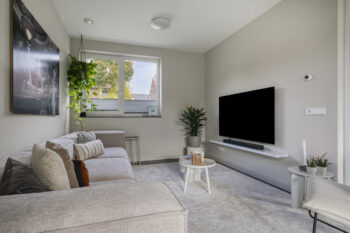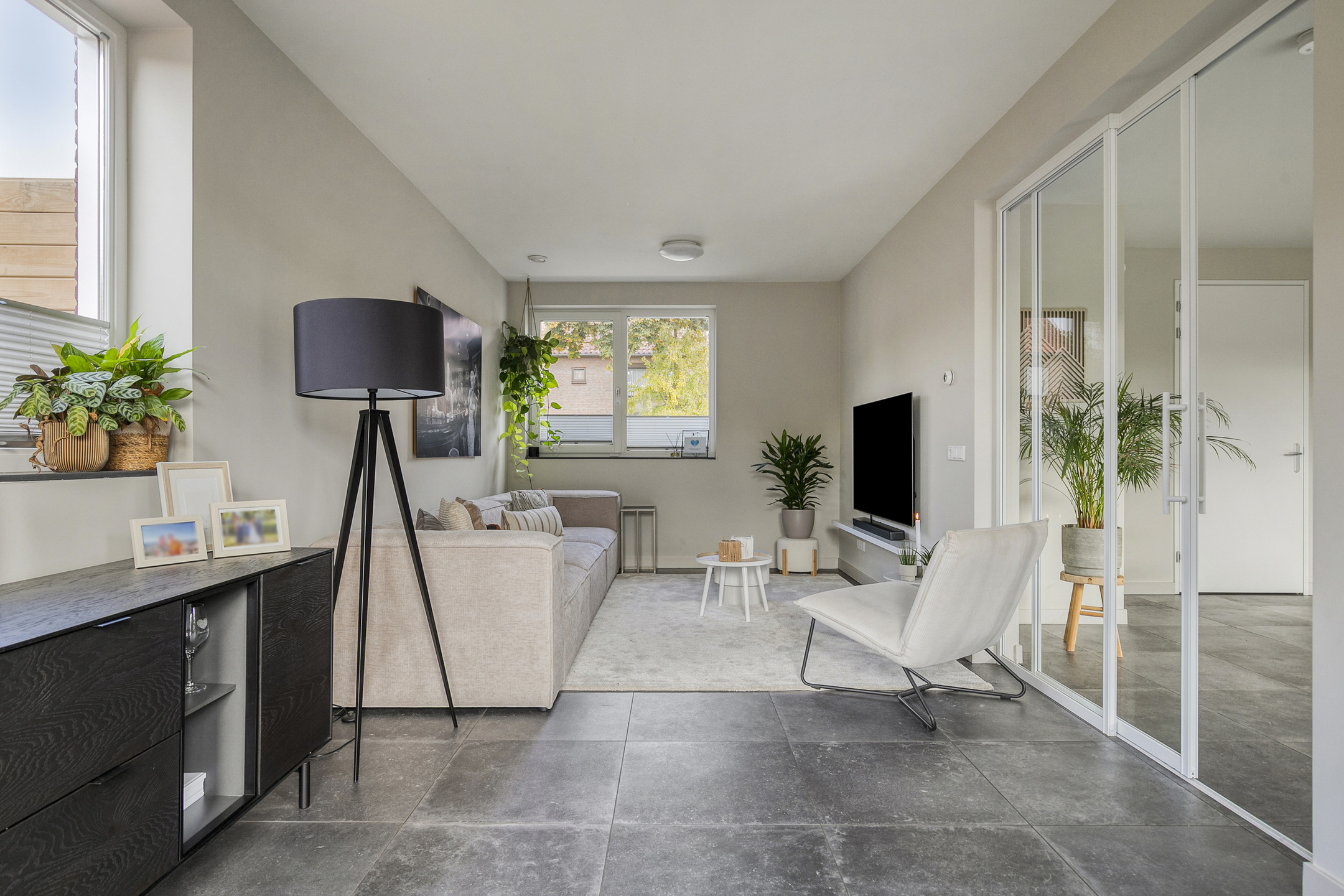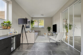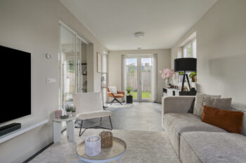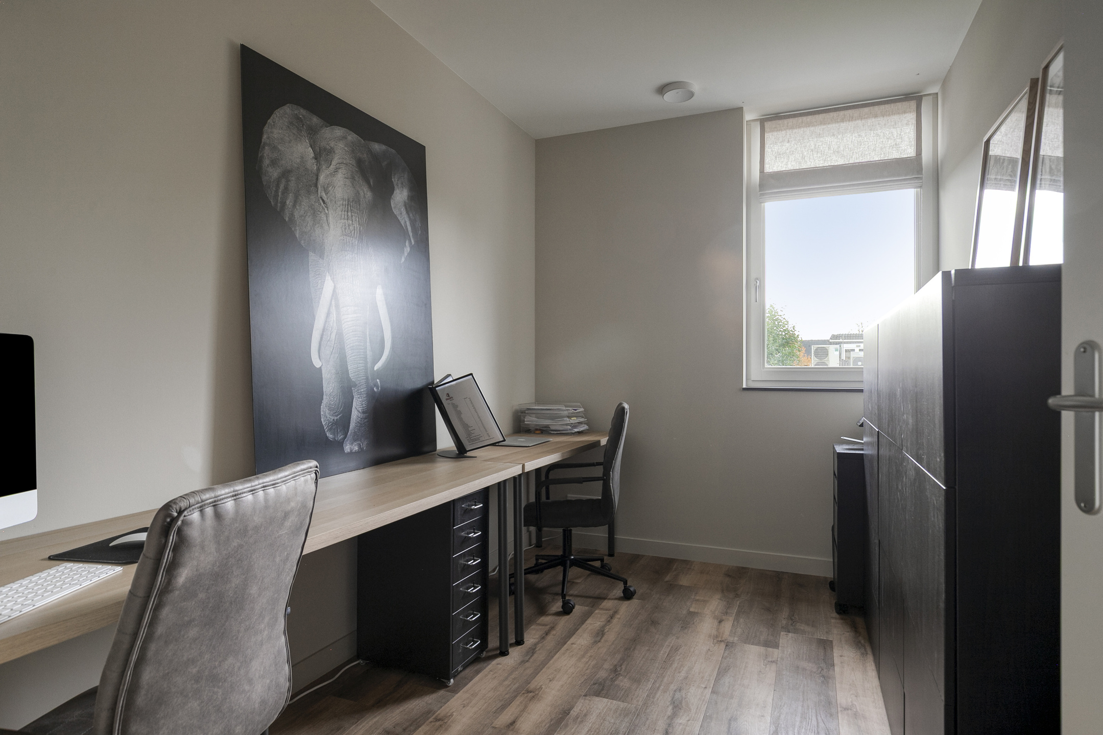 Deze woonkamer biedt echter volop flexibiliteit: ze kan ook dienen als thuiswerkplek, speelkamer of – dankzij de aanwezige aansluitingen – worden ingericht als slaapkamer met badkamer, waardoor de woning levensloopbestendig is ingericht.