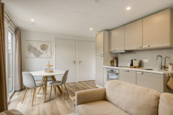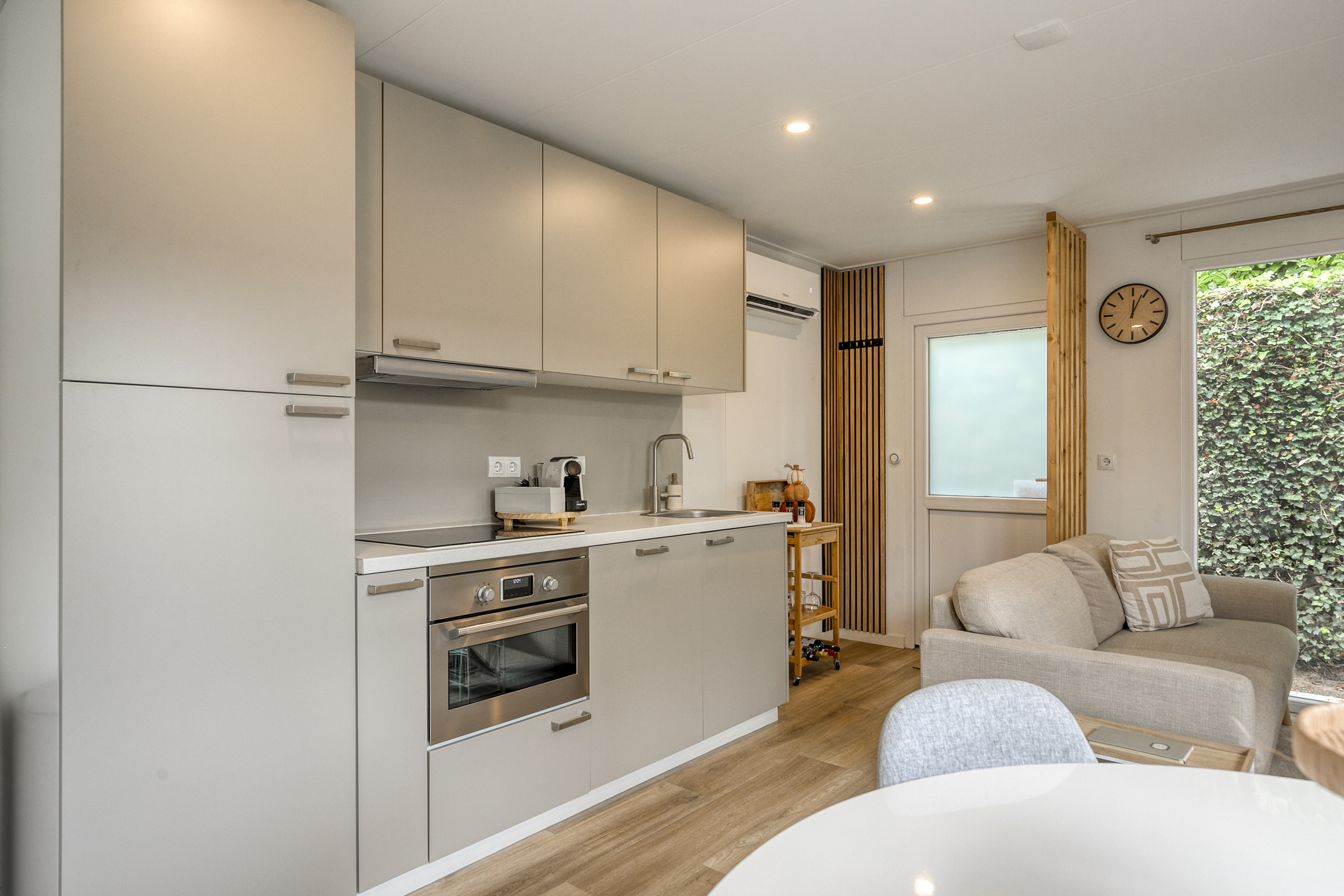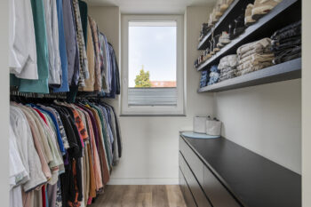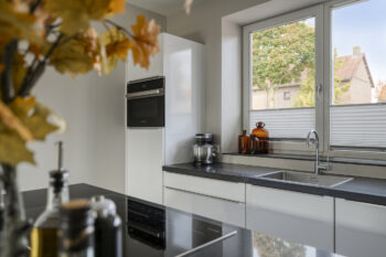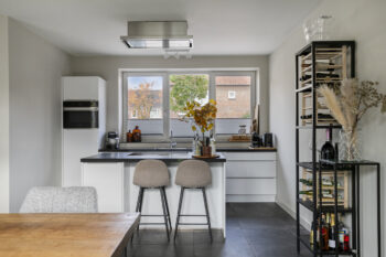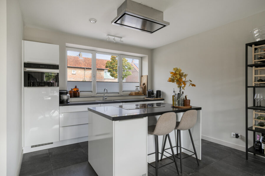 De keuken is uitgerust met hoogwaardige inbouwapparatuur zoals een inductiekookplaat, combi-oven, afzuigkap, koelkast en vaatwasser. Het strakke design met witte fronten en een donker werkblad geeft de ruimte een moderne, tijdloze uitstraling. Dankzij het grote raam valt er veel natuurlijk licht binnen, wat het geheel een frisse en open sfeer geeft. De gezellige bar met twee zitplaatsen maakt dit bovendien de perfecte plek voor een ontbijt, een kop koffie of een goed gesprek tijdens het koken.