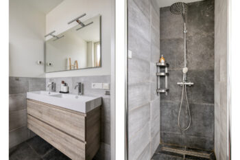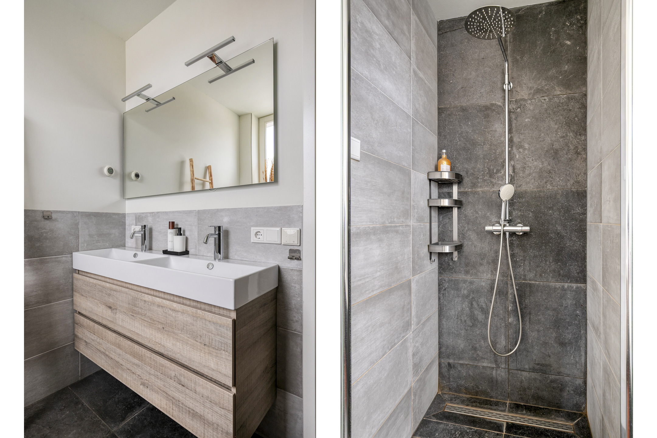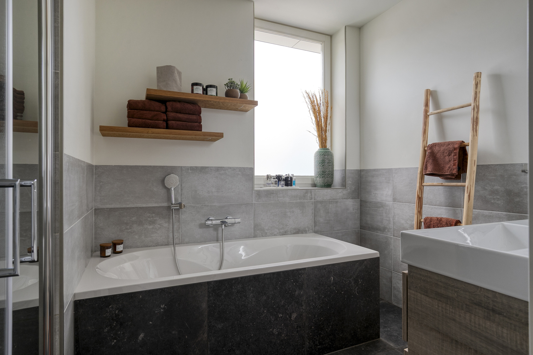 De badkamer straalt rust en comfort uit door de combinatie van natuurlijke materialen en neutrale tinten. De ruimte is voorzien van een ligbad, een inloopdouche, en een modern wastafelmeubel. De stijlvolle grijstinten op de wand-en vloertegels vormen een fraai contrast met de houten accenten, wat zorgt voor een warme en luxe sfeer. Dankzij het grote raam valt er prettig daglicht binnen, terwijl de indeling zorgt voor een praktisch en verzorgd geheel — een fijne plek om de dag ontspannen te beginnen of juist rustig af te sluiten.