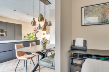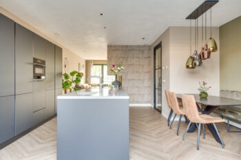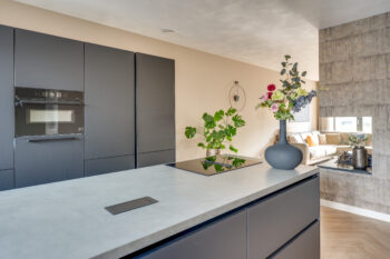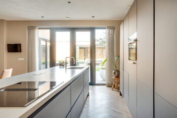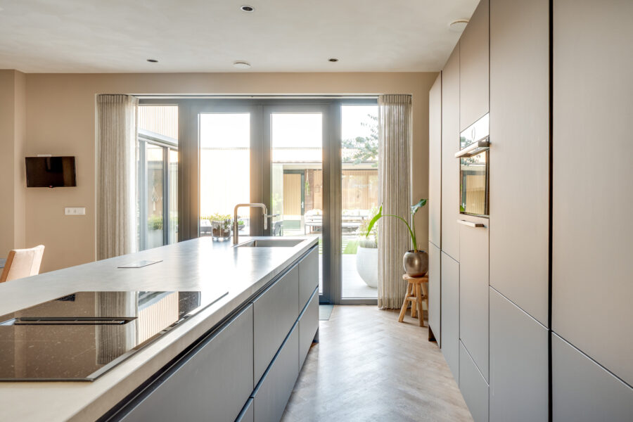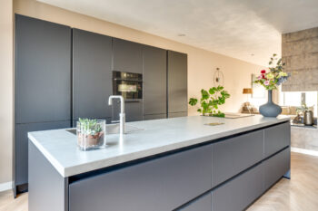 Vanuit de entree bereiken we middels een sfeervolle glazen deur de woonkeuken. Deze woonkeuken is aan de achterzijde van de begane grond gesitueerd en uitermate modern ingericht. De woonkeuken beschikt over een fraai kook- en spoeleiland voorzien van Quoocker en een inductiekookplaat met geïntegreerde afzuiginstallatie. Tegenover het eiland bevindt zich een prachtige installatiewand, voorzien van veel bergruimte in de vorm van hoge kasten. Daarbij ook voorzien van een koelkast, combi-oven, vaatwasser en vriezer.