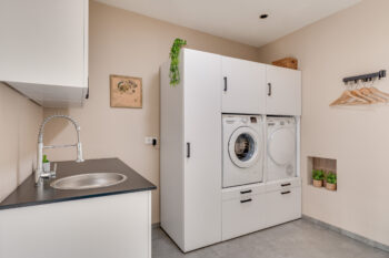 Grenzend aan de oprit en vanuit de entree toegankelijk, deze multifunctionele ruimte is perfect voor degene welke op zoek is naar een werkplek aan huis in de vorm van salon of kantoorruimte. Deze ruimte is voorzien van wateraansluiting en bergruimte, derhalve is het gebruik als bijkeuken of wasruimte ook uitermate geschikt.