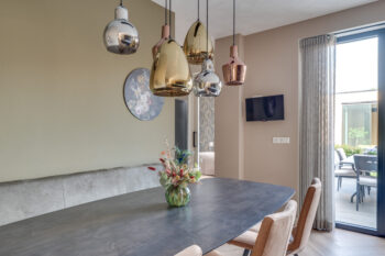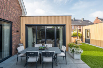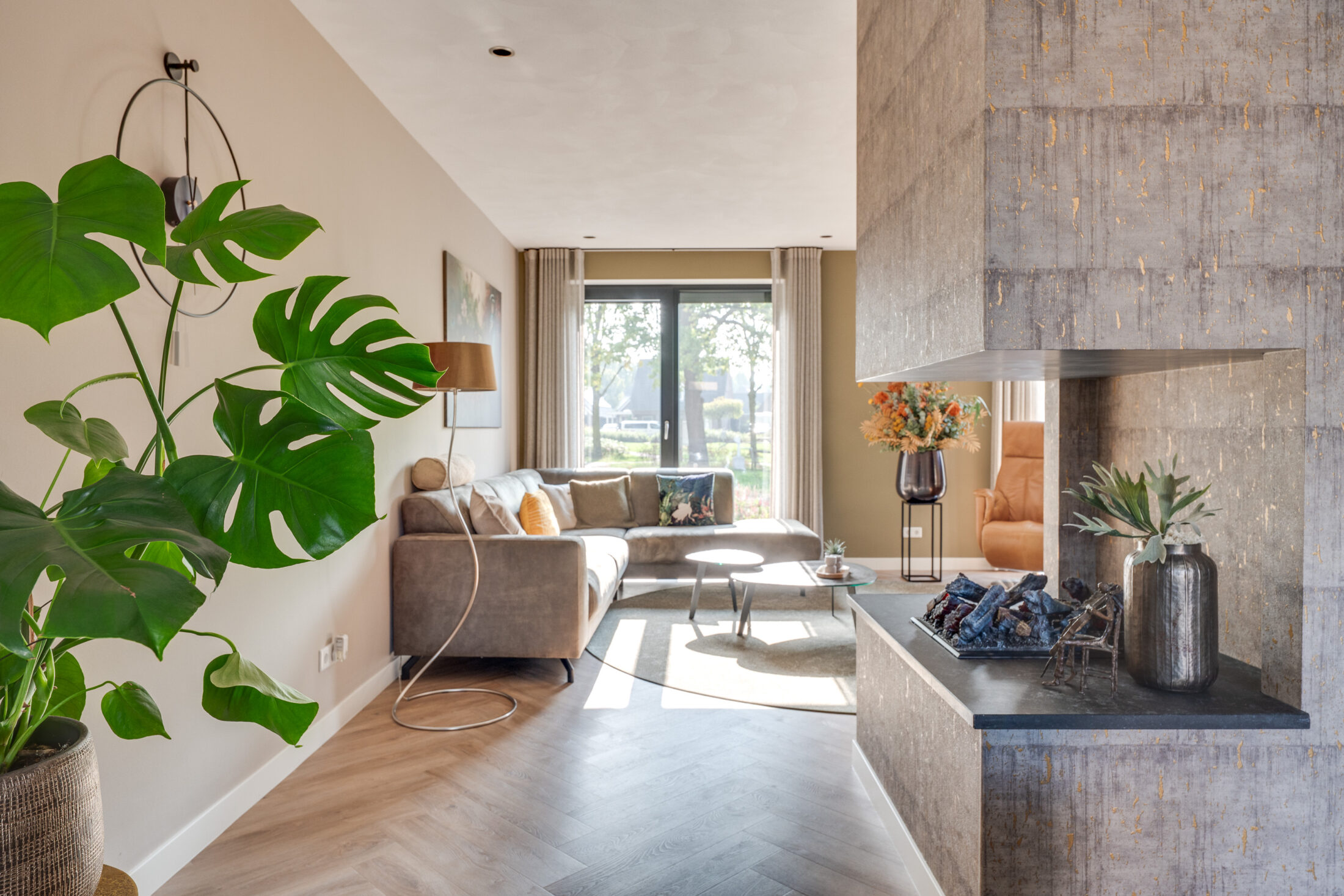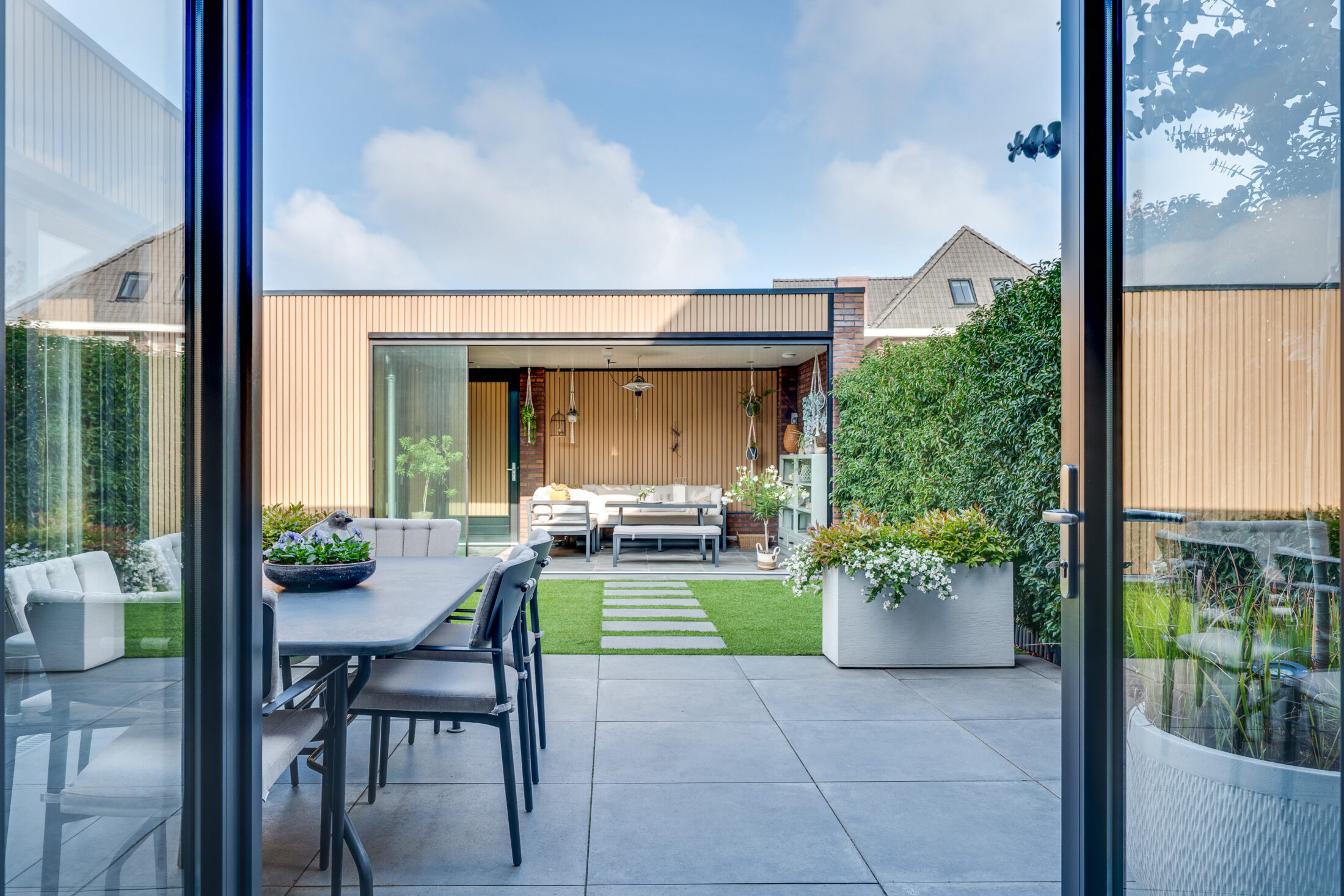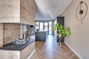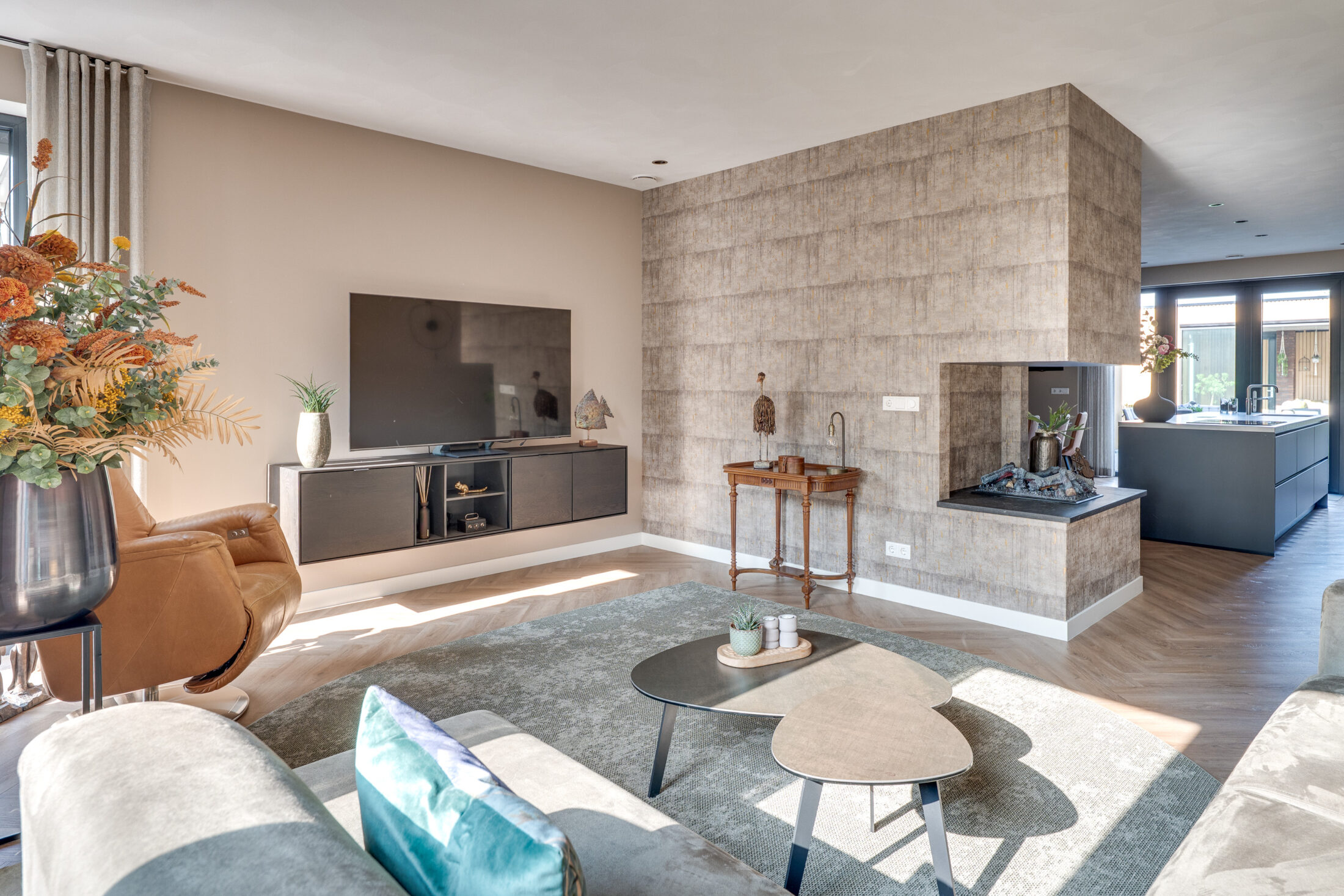 De woonkeuken biedt tevens ruimte om een gezellige dinertafel te plaatsen en wordt gescheiden van de woonkamer middels een sfeervolle haard. De woonkeuken is voorzien van een grote pui welke beschikt over dubbele tuindeuren. Deze dubbele tuindeuren verzorgen de toegang tot de achtertuin en zijn terras.