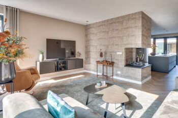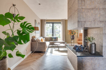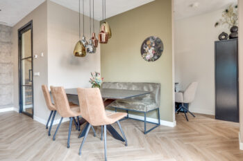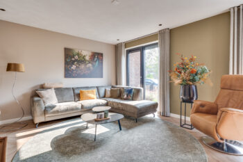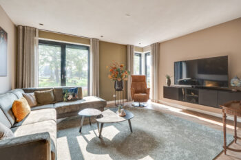 Aan de voorzijde van de woning bevindt zich de zithoek, een ruime doch gezellige plek welke u vanwege zijn aanwezige oppervlakte de mogelijkheid biedt een sfeervolle ruimte te creëren. De aanwezigheid van de raamkozijnen welke tot de vloer gelegen zijn verzorgt uitermate veel natuurlijk daglichtinval alsook een prachtig uitzicht over het aan de voorzijde gelegen park. Ten behoeve van verduistering beschikken deze kozijnen allen over screens welke elektrisch te bedienen