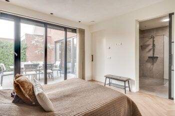 natuurlijk daglichtinval dankzij het grote raamkozijn grenzend aan het terras van de tuin. Deze slaapkamer is voorzien van