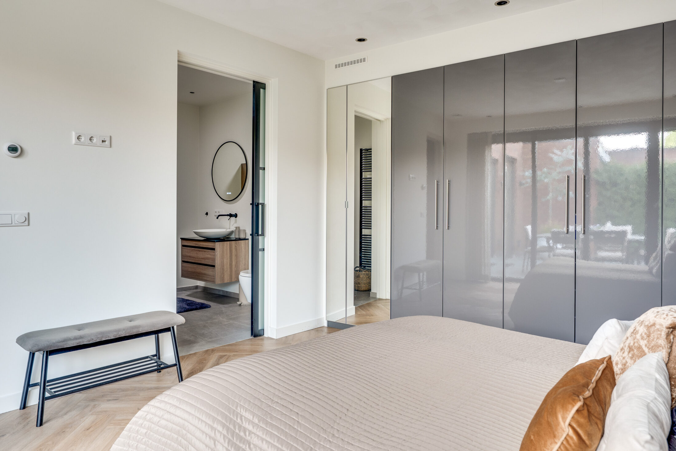 Vanuit het portaal grenzend aan de woonkeuken krijgen we toegang tot deze fijne slaapkamer welke voorzien is van veel