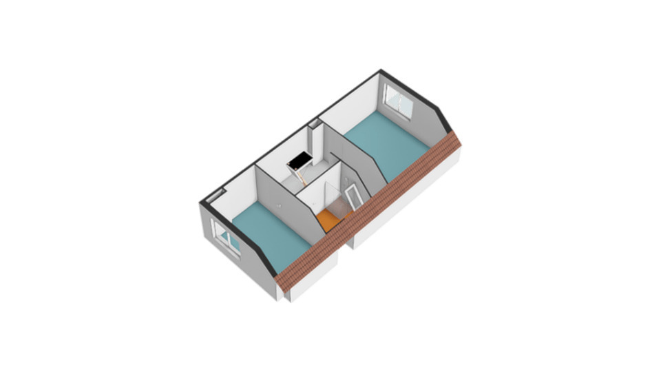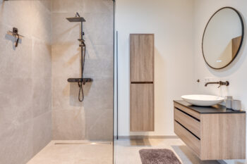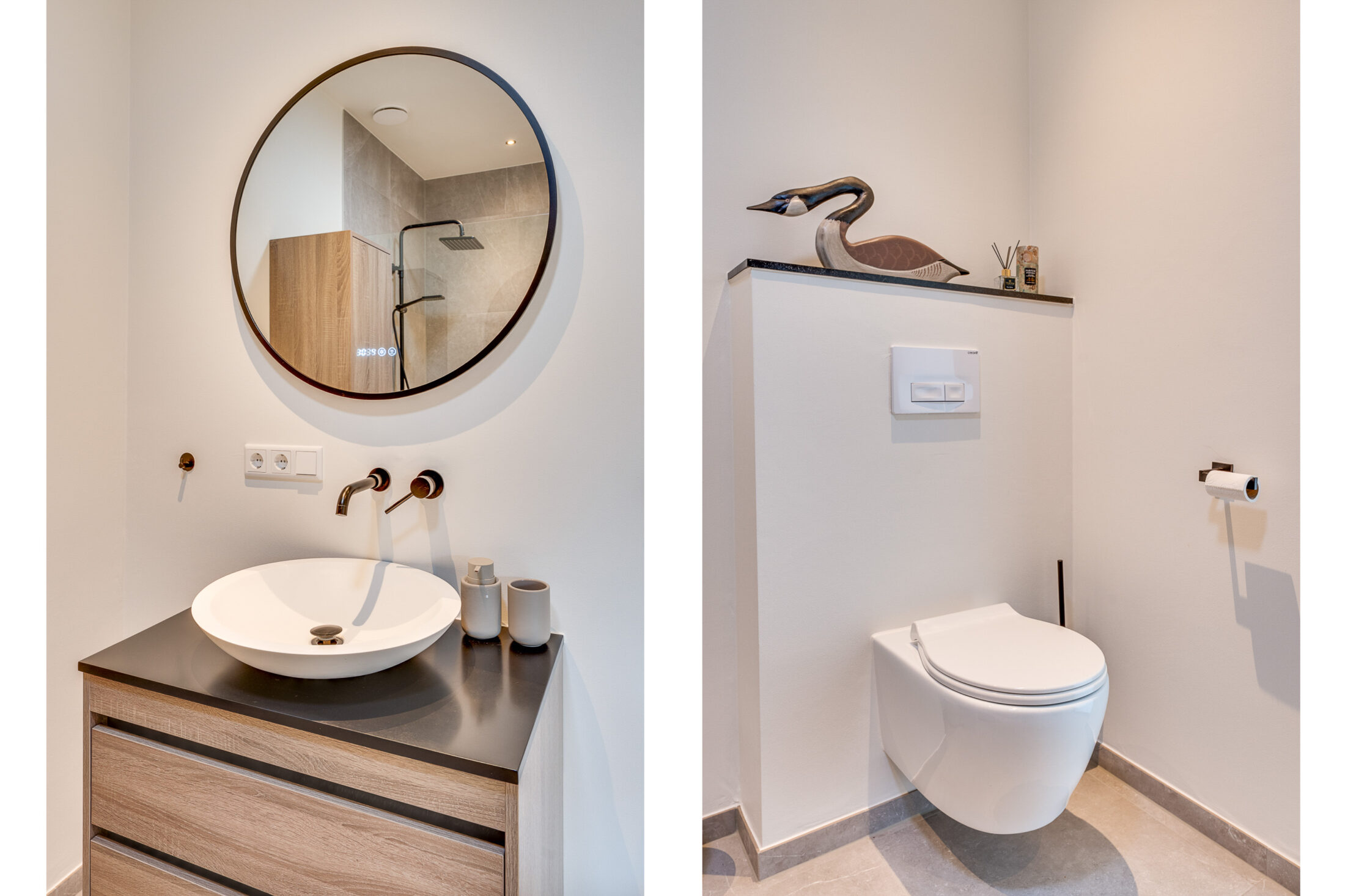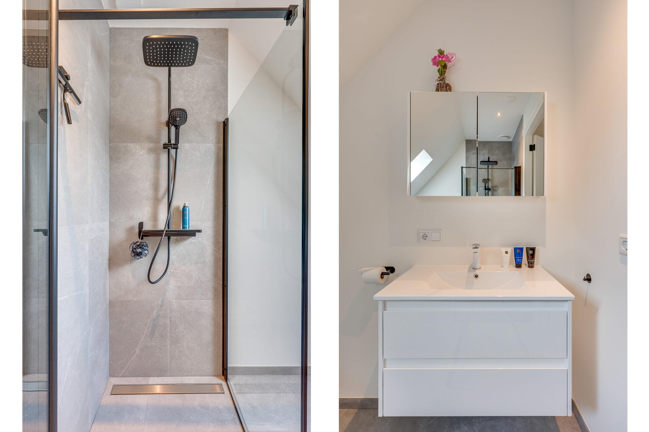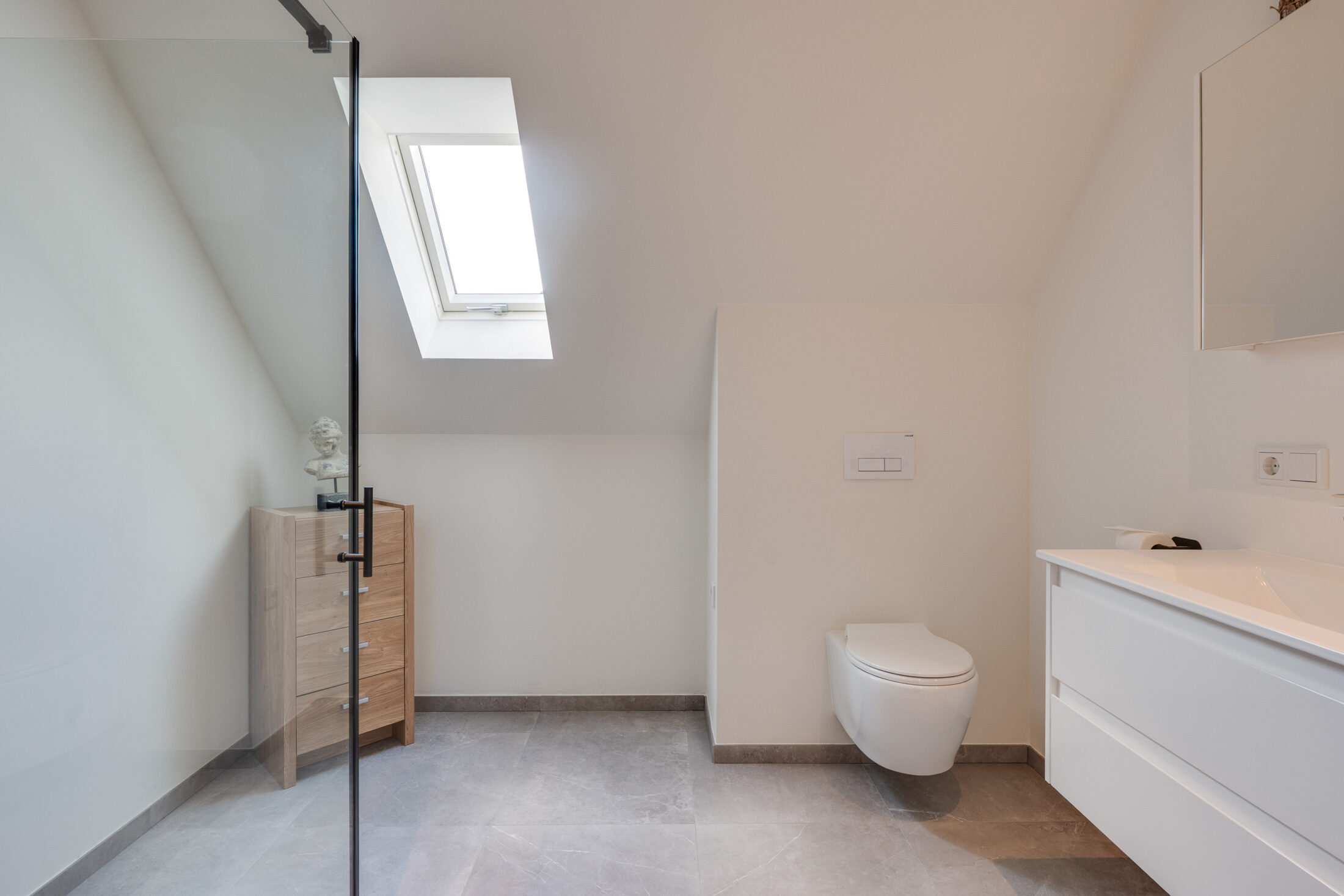 Tussen de slaapkamers op de eerste verdieping bevindt zich de badkamer. Deze badkamer is voorzien een inloopdouche, wandcloset en wastafelmeubel. Voor wat betreft natuurlijk daglichtinval en ventilatie beschikt deze tweede badkamer over een groot dakraam.