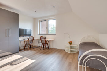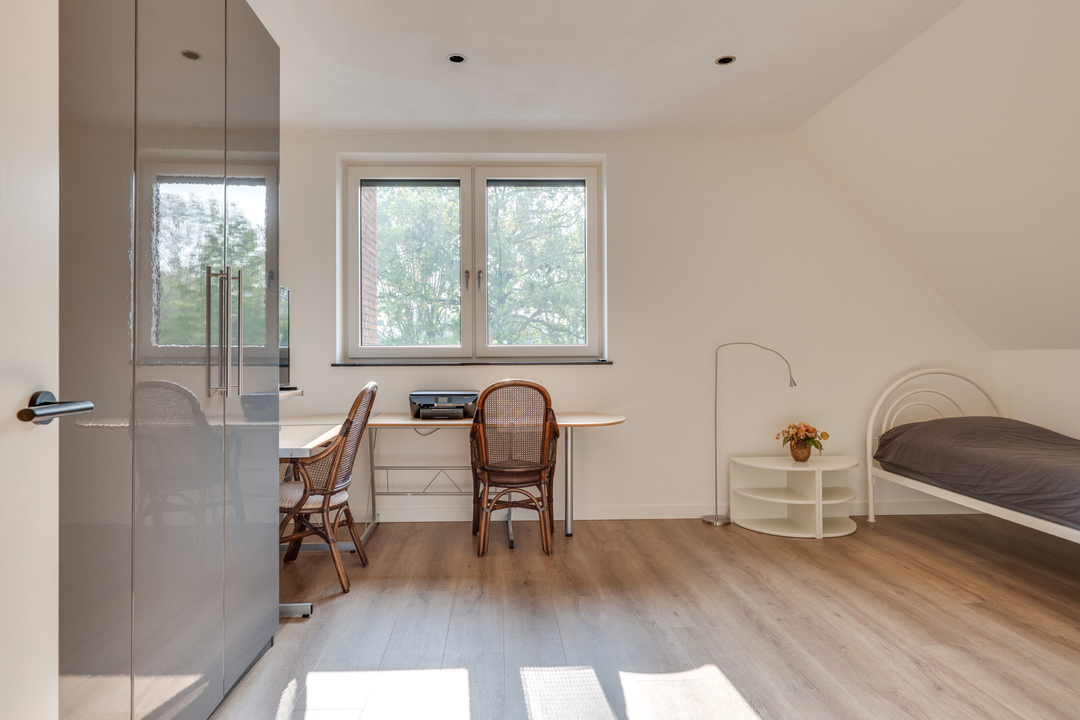 Aan de voorzijde van de eerste verdieping bevindt zich de tweede, wederom ontzettend ruime, slaapkamer van deze woning. Met een oppervlakte van maar liefst circa 21 m² heeft u talloze mogelijkheden en indelingsopties tot uw beschikking. Hetzelfde geldt voor de derde slaapkamer gelegen aan de achterzijde van deze verdieping. Voor wat