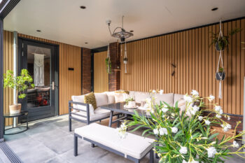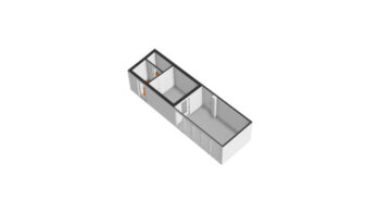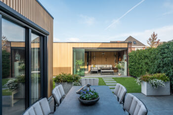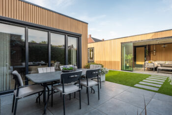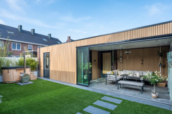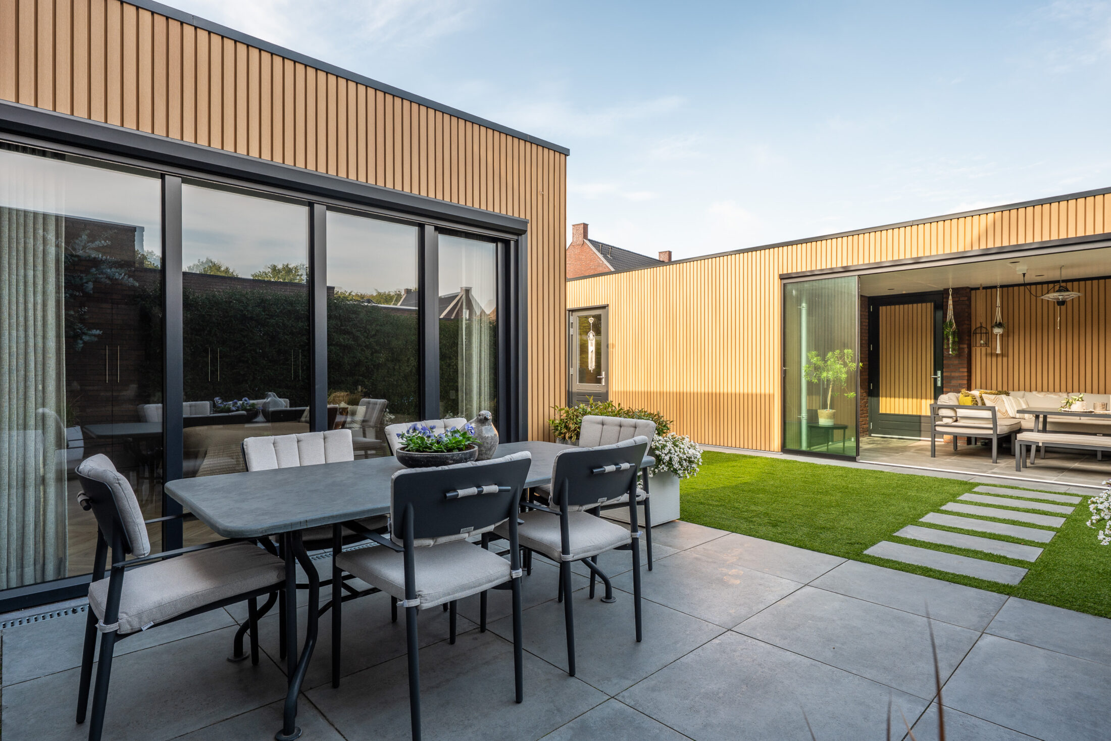 De bergingsruimte is opgedeeld in twee compartimenten, de linkerzijde beschikt over een toilet in de vorm van een wandcloset en biedt de mogelijkheid een sauna te plaatsen! Vanuit dit eerste gedeelte bereiken we een tweede bergingsruimte welke perfect dient als opslag voor uw hobbymaterialen. Vanuit de afsluitbare deur is het overdekt terras toegankelijk, dit overdekt terras is tevens voorzien van glazenwanden. Aan de achterzijde van dit moderne overdekt terras bevindt zich een deur welke als achterom fungeert. Om eenheid te creëren is deze bergingsruimte voorzien van gevelbekleding in dezelfde moderne stijl ten opzichte van de woning, een prachtig geheel!