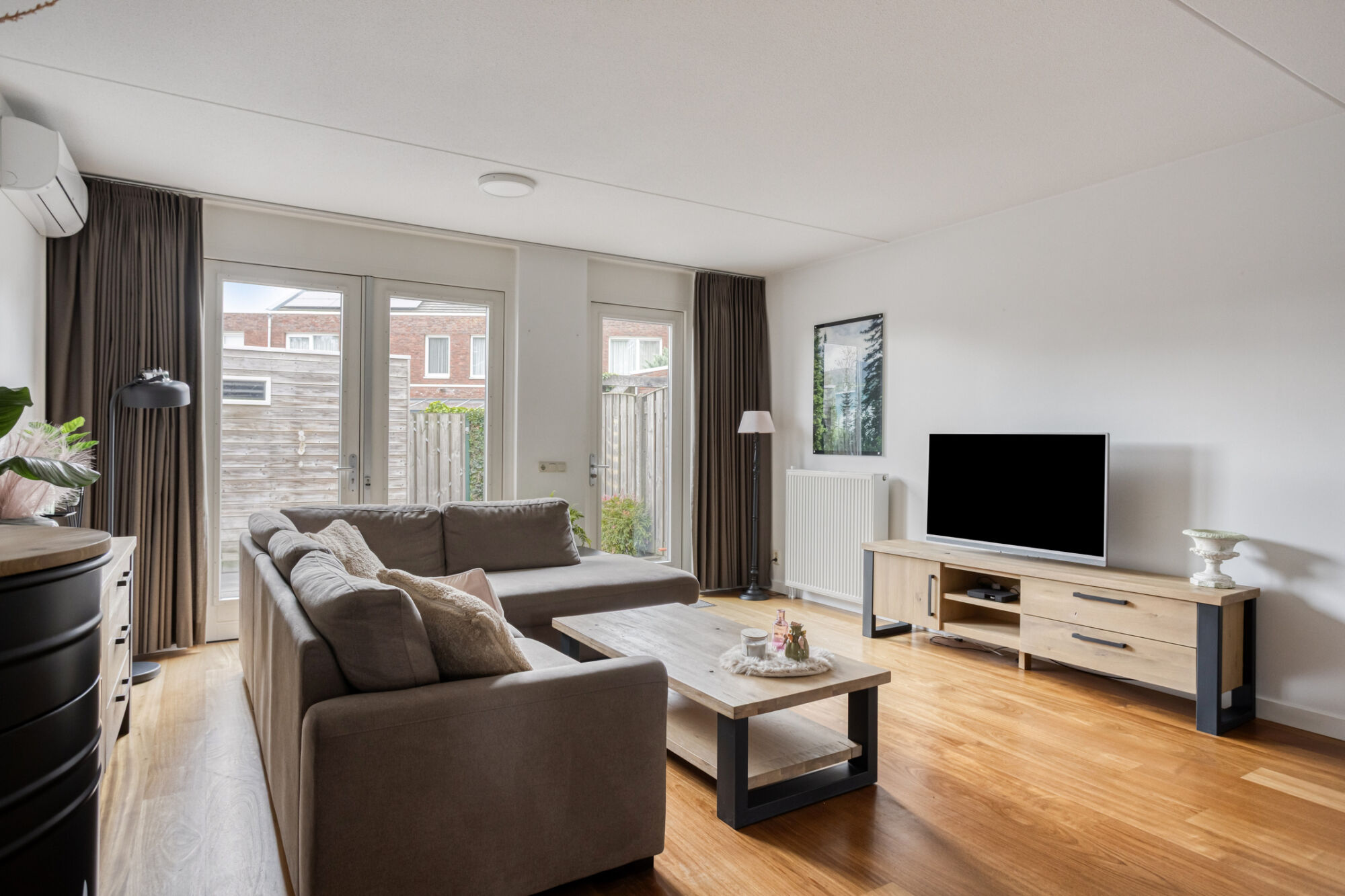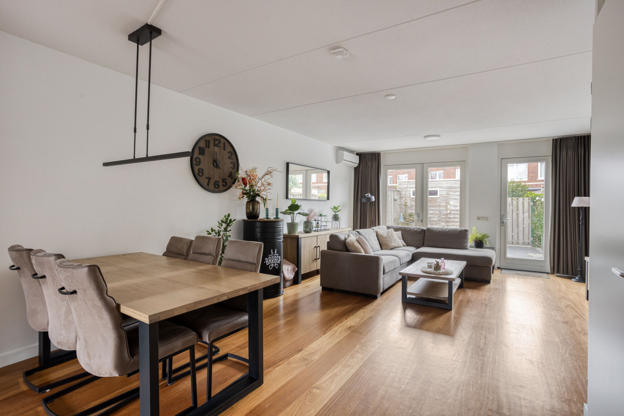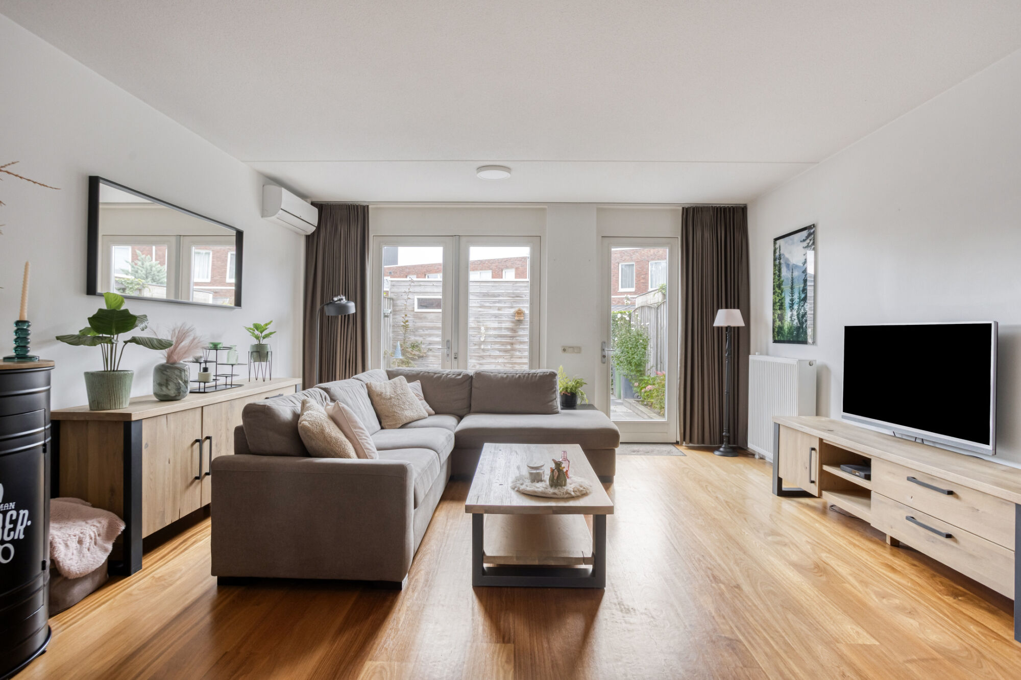 De royale living kenmerkt zich door veel lichtinval vanwege de grote raampartijen. Mede door de hoge plafonds wordt het gevoel van ruimtelijkheid vergroot. De airco zorgt voor extra comfort in de zomerdagen en in de winterdagen.